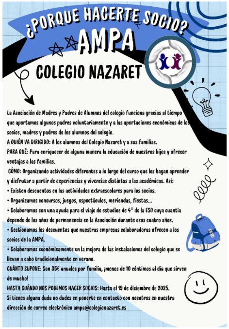 Si tienes alguna duda, pónte en contacto con nosotros en nuestra dirección de correo electrónico: ampa@colegionazaret.es
