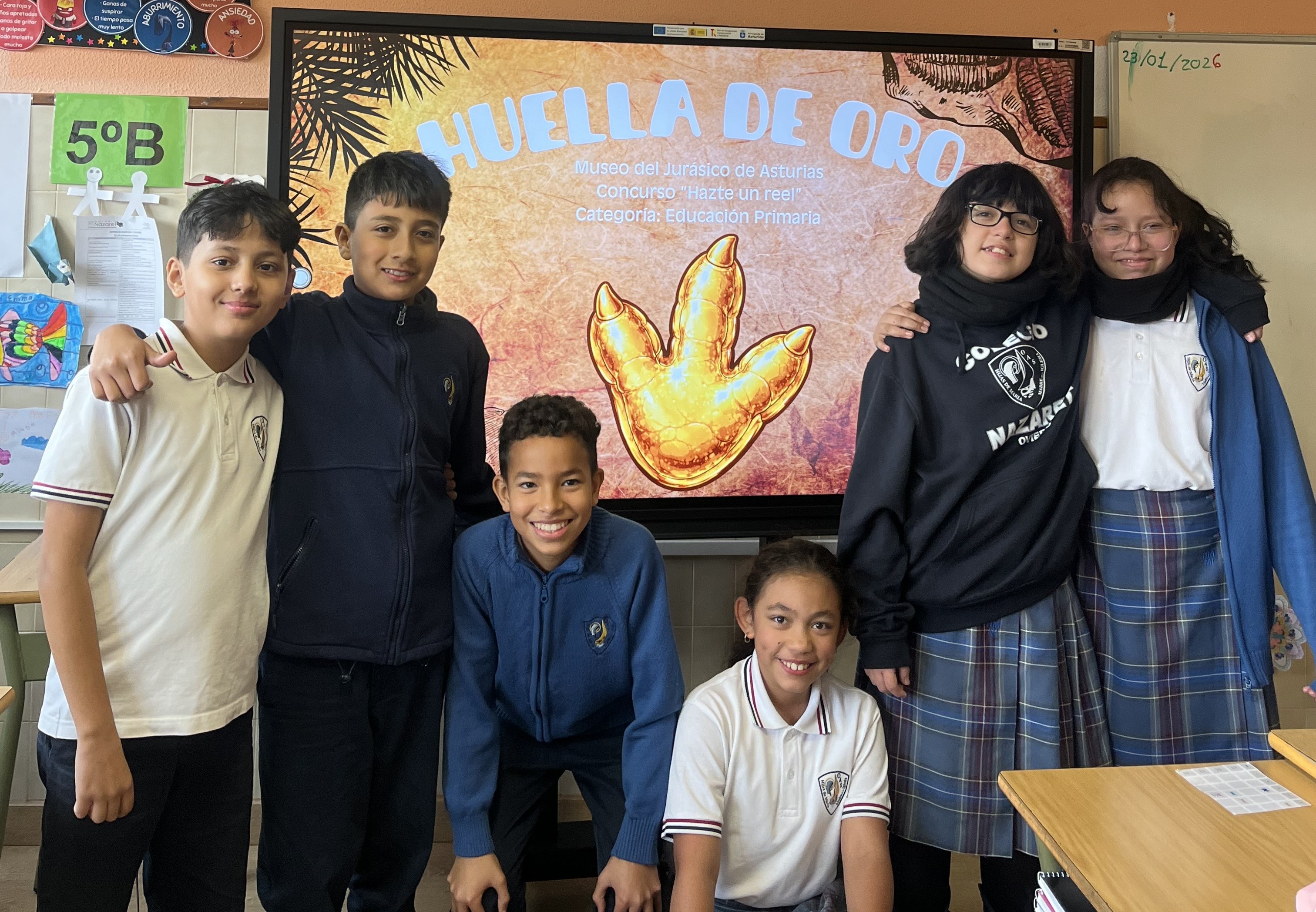 Los alumnos de 5°de Educación Primaria participaron, desde la asignatura de Cultura Asturiana, en el concurso “Hazte un reel” organizado por el Museo Jurásico de Asturias. Uno de los grupos ha resultado ser ganador de la Huella de Oro en la categoría de Educación Primaria. Los alumnos, premiados por su vídeo titulado “Dinosaurio Challenge”, son: Atiksh Bhandari, Nicolás Blanco López, Elisa Rebbeca Bretoneche Purizaca, Valeska Antonella Duque Fernández, Aarón Manjarres Camargo, Valeria Patricia Solé Butrón y Emmanuel Villa López.