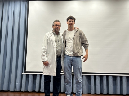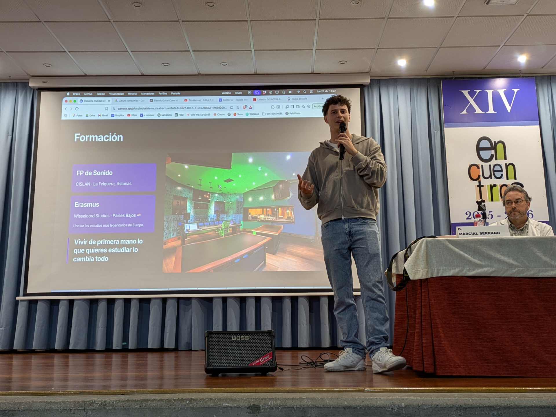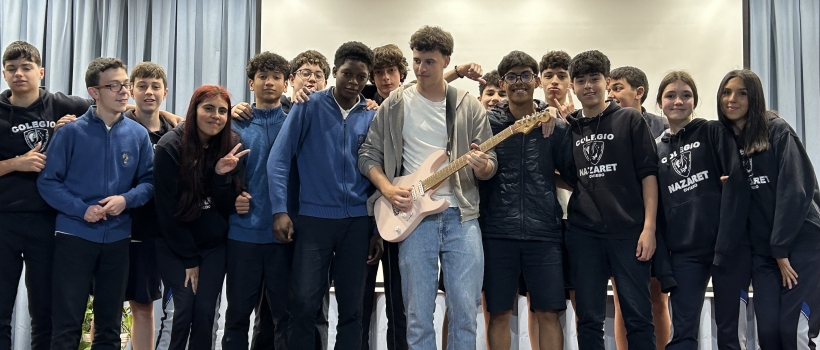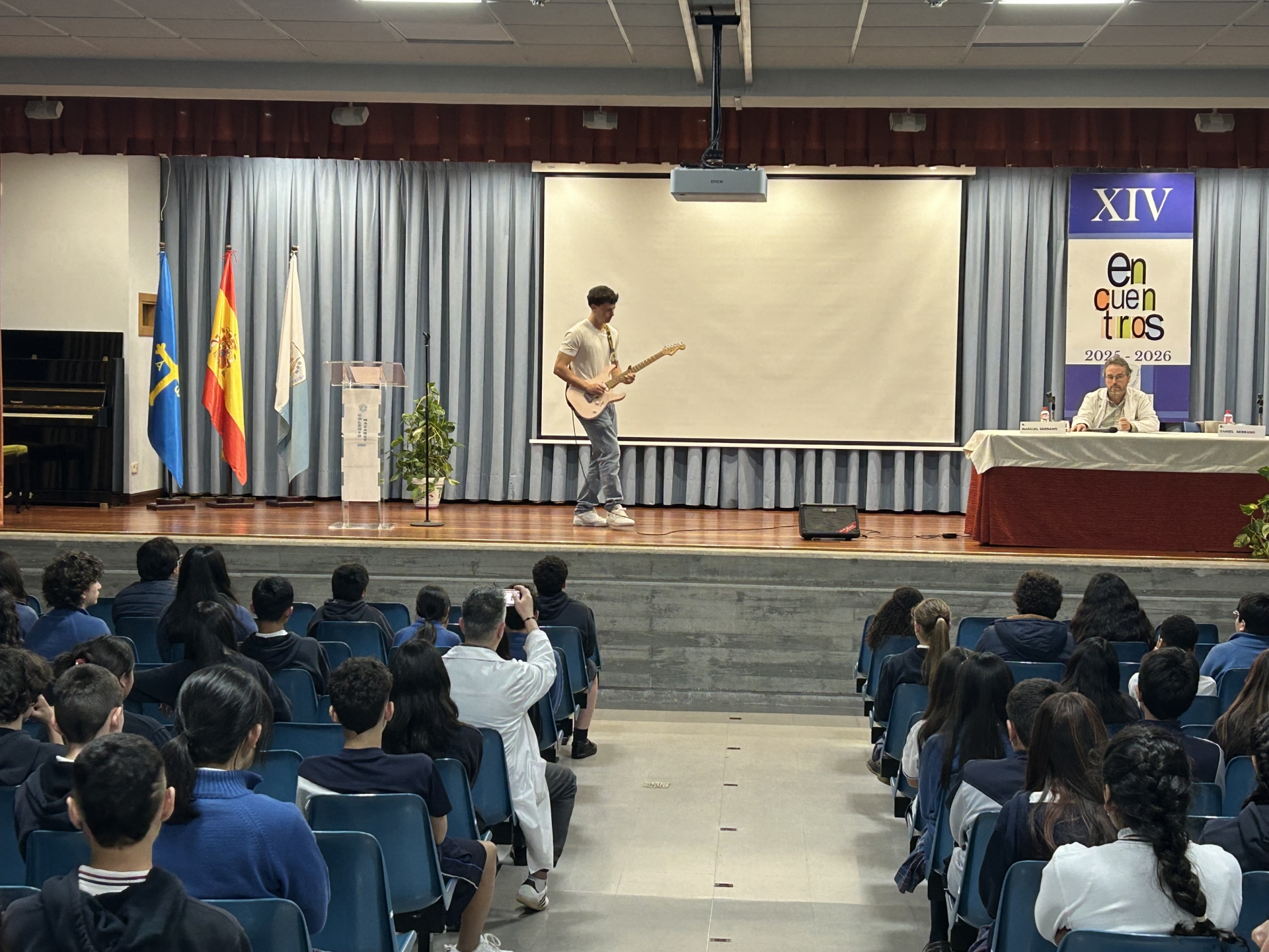 En la segunda ponencia del día, contamos con la presencia del joven músico Daniel Serrano, guitarrista y productor musical. Comenzó contando cómo surgió su vocación musical, sus estudios y primeros pasos, su formación en la prestigiosa productora neerlandesa de WisseloordStudios. Después fue desgranando las fases de la creación de un tema y los secretos del programa que ayuda al compositor. Y pasó a la acción interpretando en directo con su guitarra eléctrica un clásico como “Sultans of swing”, de Dire Straits y “Back in black”, de AC/DC. ¡Cómo disfrutamos de la música en directo! Finalmente, pasó al turno de preguntas de los alumnos, que contestó con sinceridad y amenidad, animando a todos a luchar por sus sueños, con paciencia y pasión. Y, después, fotos, risas y hasta autógrafos… ¡Nos vemos en las RRSS!