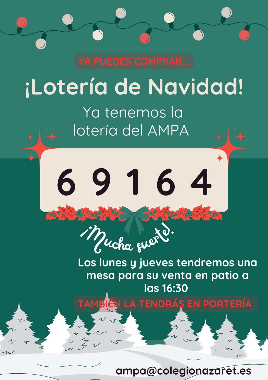 Los lunes y jueves por la tarde, a partir de las 16:30 horas, se pone a la venta en el patio la lotería de Navidad de la AMPA del colegio. ¡Colabora y...que la suerte te acompañe!