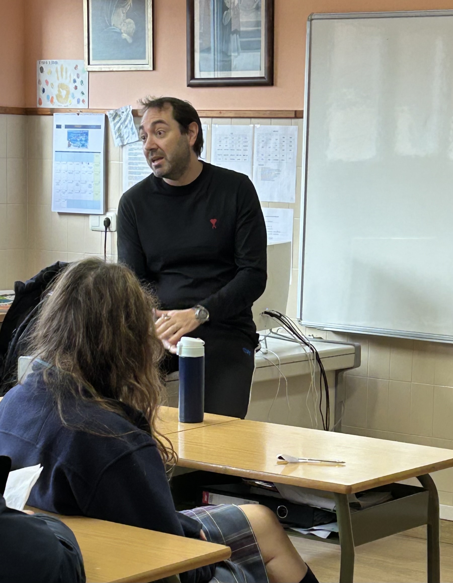 También alumnas y alumnos dieron pie con sus preguntas a que el autor nos contara sobre su vida como joven, su profesión de escritor y su objetivo. A raíz de una pregunta de un alumno, contó cómo había realizado el proceso de escritura de En las redes del miedo: primero escribió un esquema del relato de los dos protagonistas, para después encajar toda la historia sin contradicciones, basada en algunos datos reales vividos por el propio autor.