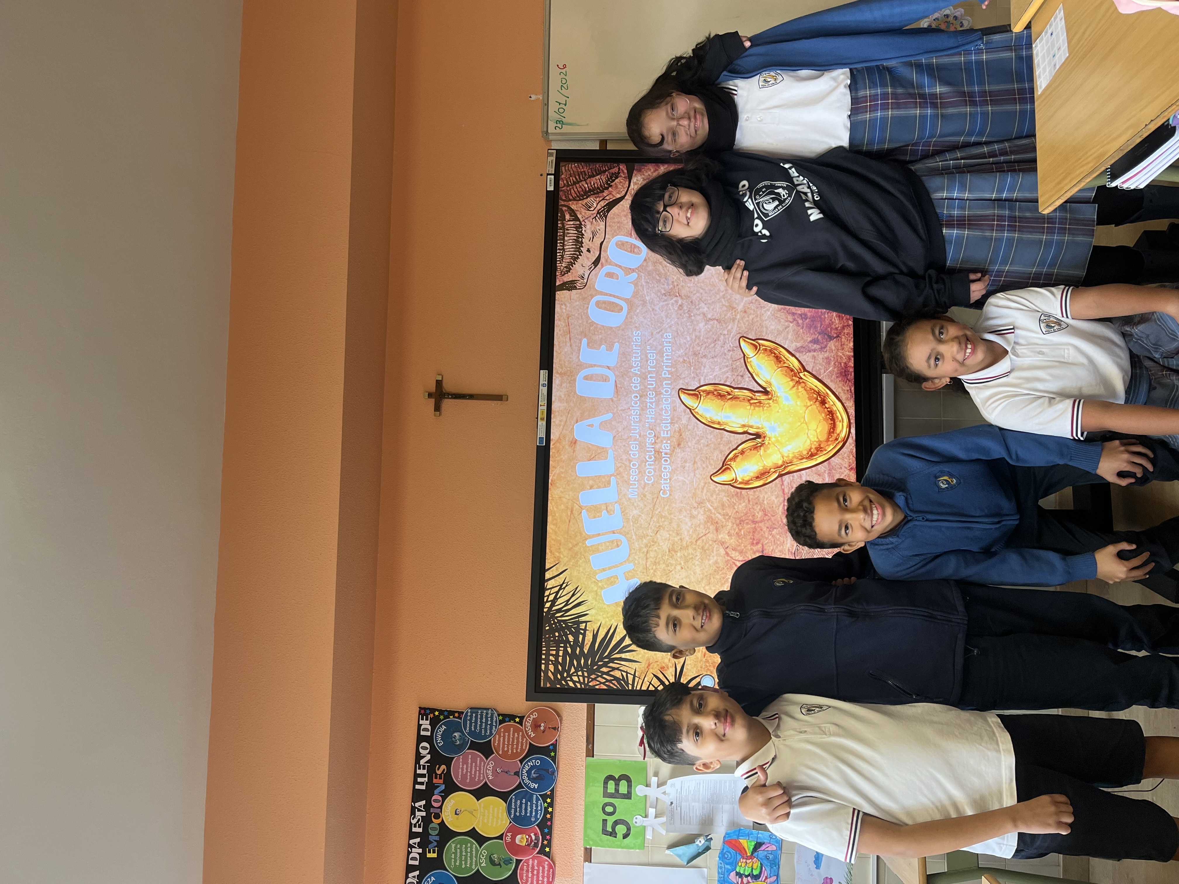 Los alumnos de 5°de Educación Primaria participaron, desde la asignatura de Cultura Asturiana, en el concurso “Hazte un reel” organizado por el Museo Jurásico de Asturias. Uno de los grupos ha resultado ser ganador de la Huella de Oro en la categoría de Educación Primaria. Los alumnos, premiados por su vídeo titulado “Dinosaurio Challenge”, son: Atiksh Bhandari, Nicolás Blanco López, Elisa Rebbeca Bretoneche Purizaca, Valeska Antonella Duque Fernández, Aarón Manjarres Camargo, Valeria Patricia Solé Butrón y Emmanuel Villa López.