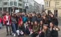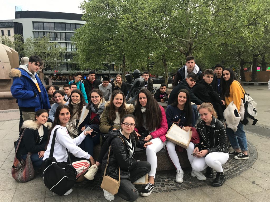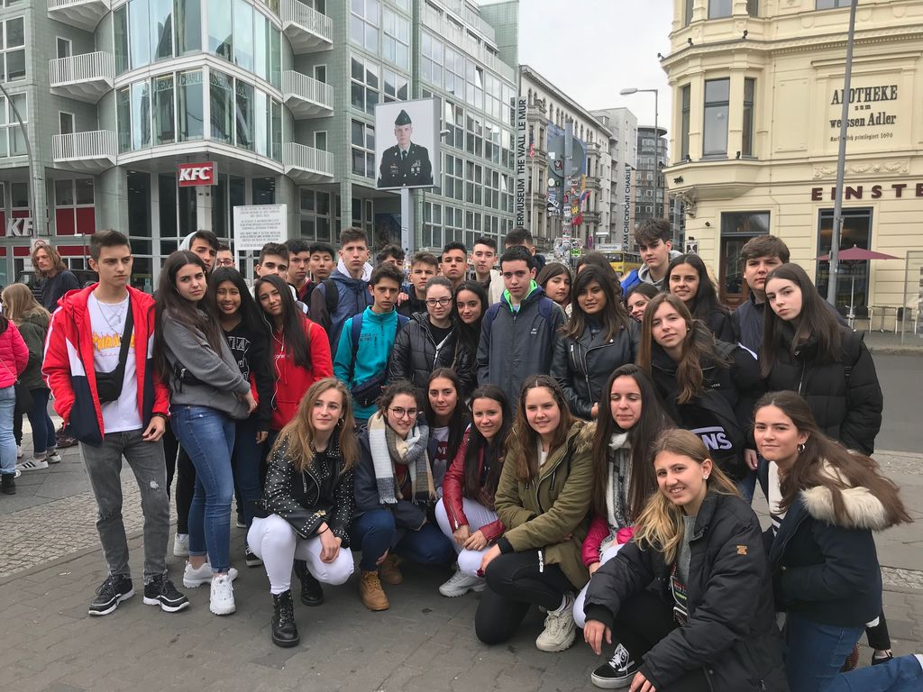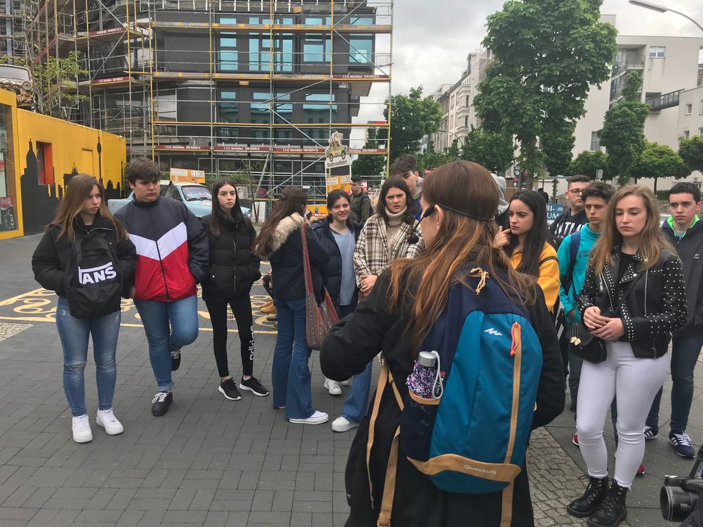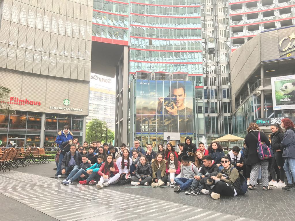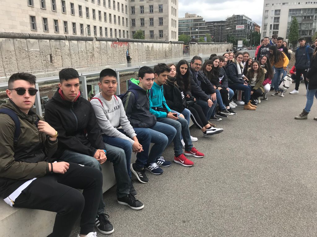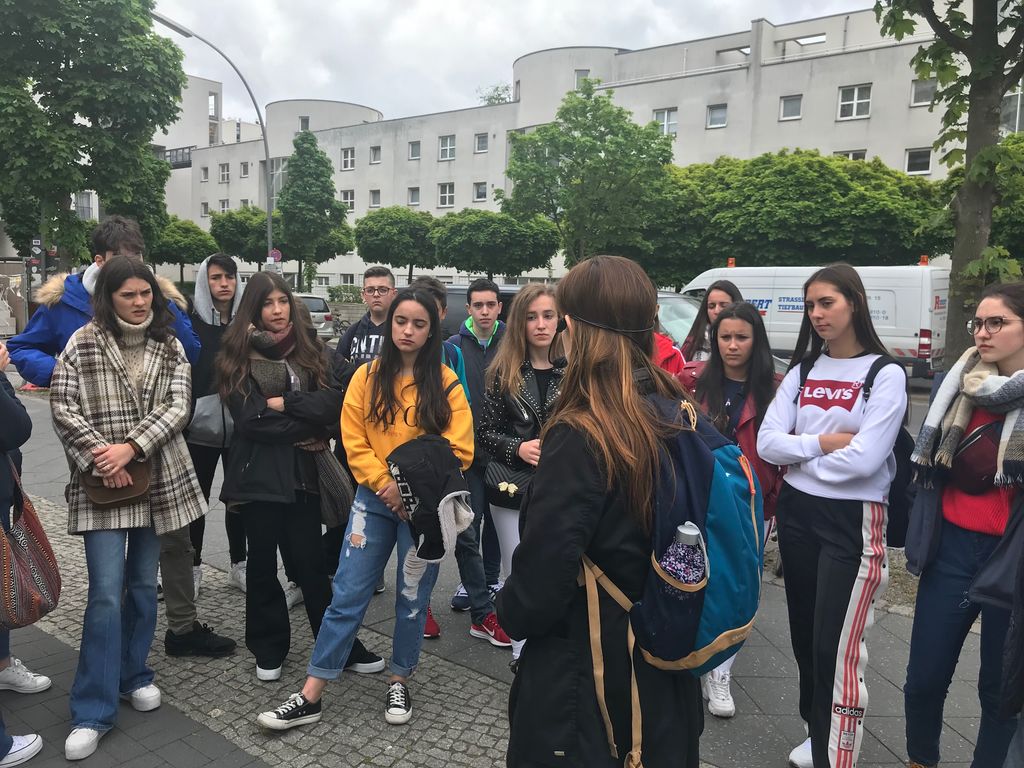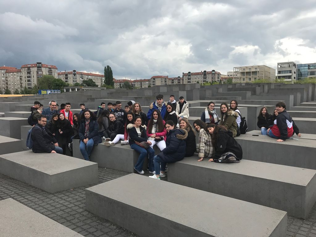 Anduvimos luego hasta el único edificio público que quedó en pie después de la Batalla de Berlín en 1945, el Ministerio de la Lüftwaffe. Lucía nos introdujo algo de la Historia del Tercer Reich para la visita de mañana al Campo de Concentración de Sachsenhausen y el lunes a la Topografía del Terror. Luego nos llegamos hasta Postdammerplatz, hoy moderna y futurista reconstruida con rascacielos espectaculares como el Sony Center. Ahí nos despedimos de las hermanas de Lucía y su sobrino, que nos acompañaron parte de la visita. Lucía nos condujo hasta el Memorial del Holocausto Judío, monumento conceptual y sobrecogedor. El último lugar con nuestra guía fue el Reichstag, que además coincidió con el 79 aniversario del fin de la Guerra para los soviéticos. Muchos eran los descendientes de los que lucharon y colocaron la bandera roja sobre el edificio del parlamento. Iban vestidos con uniformes y portaban retratos de sus familiares, héroes de una Guerra que no han olvidado. Nos despedimos de Lucía hasta el sábado. Cogimos el bus 100 hasta la estatua de la Victoria en el corazón del Tiergarten. Subimos y dimos fe de esta ciudad sin límites. Y luego otro 100 y hasta el barrio de Zoologischer. Allí comimos y mercamos. Otro 100 y hasta Alexanderplatz. Allí negociamos las bicis de mañana para el Tiergarten. Y finalmente, en el lugar más ansiado e idolatrado para nuestros chavales: EL HOTEL, auténtico paraíso de la convivencia para ellos. No tanto para el Staff de seguridad y para sus tutores. Bis morgen."
