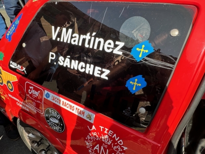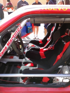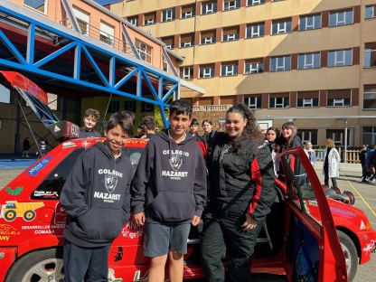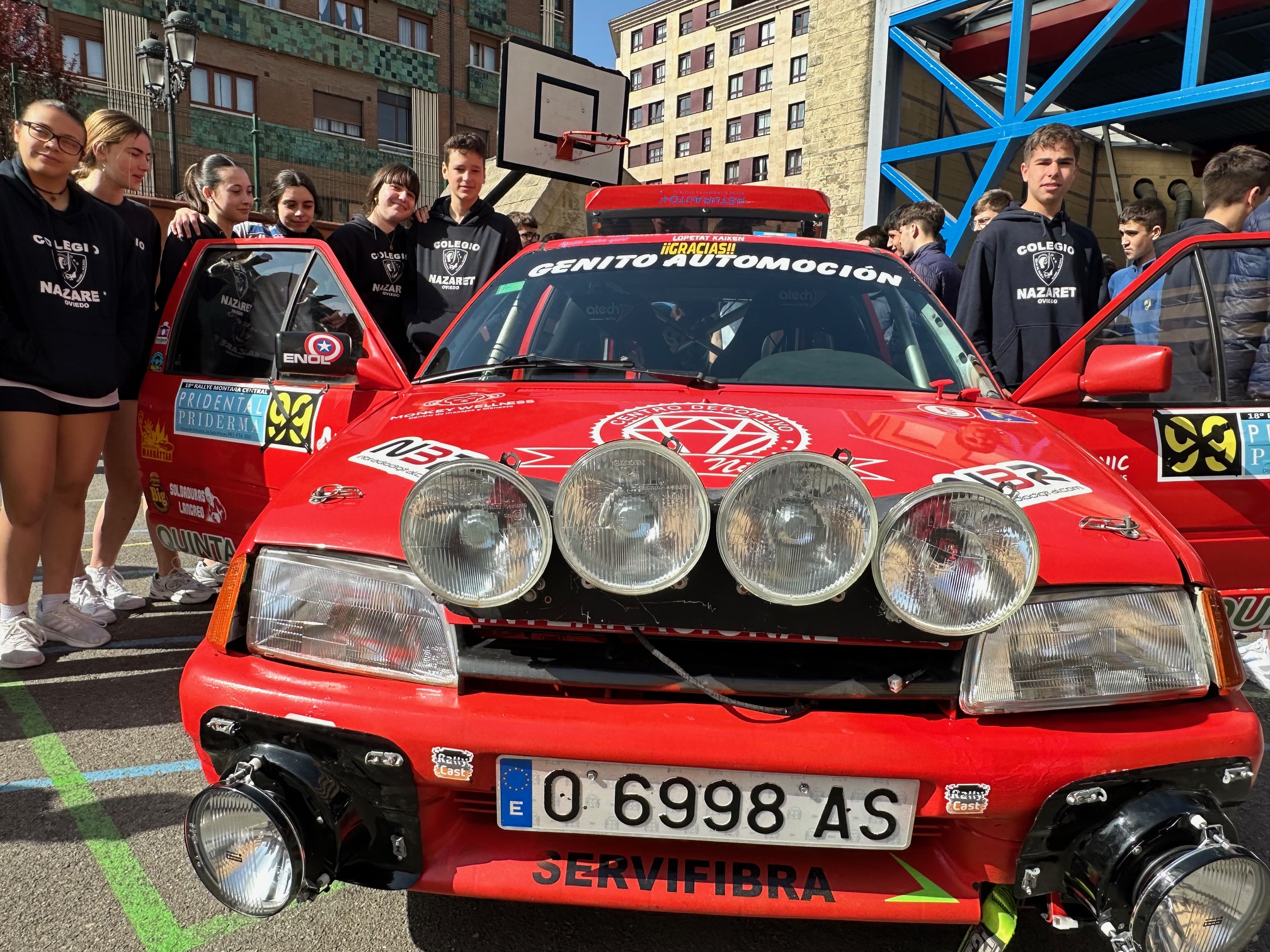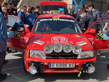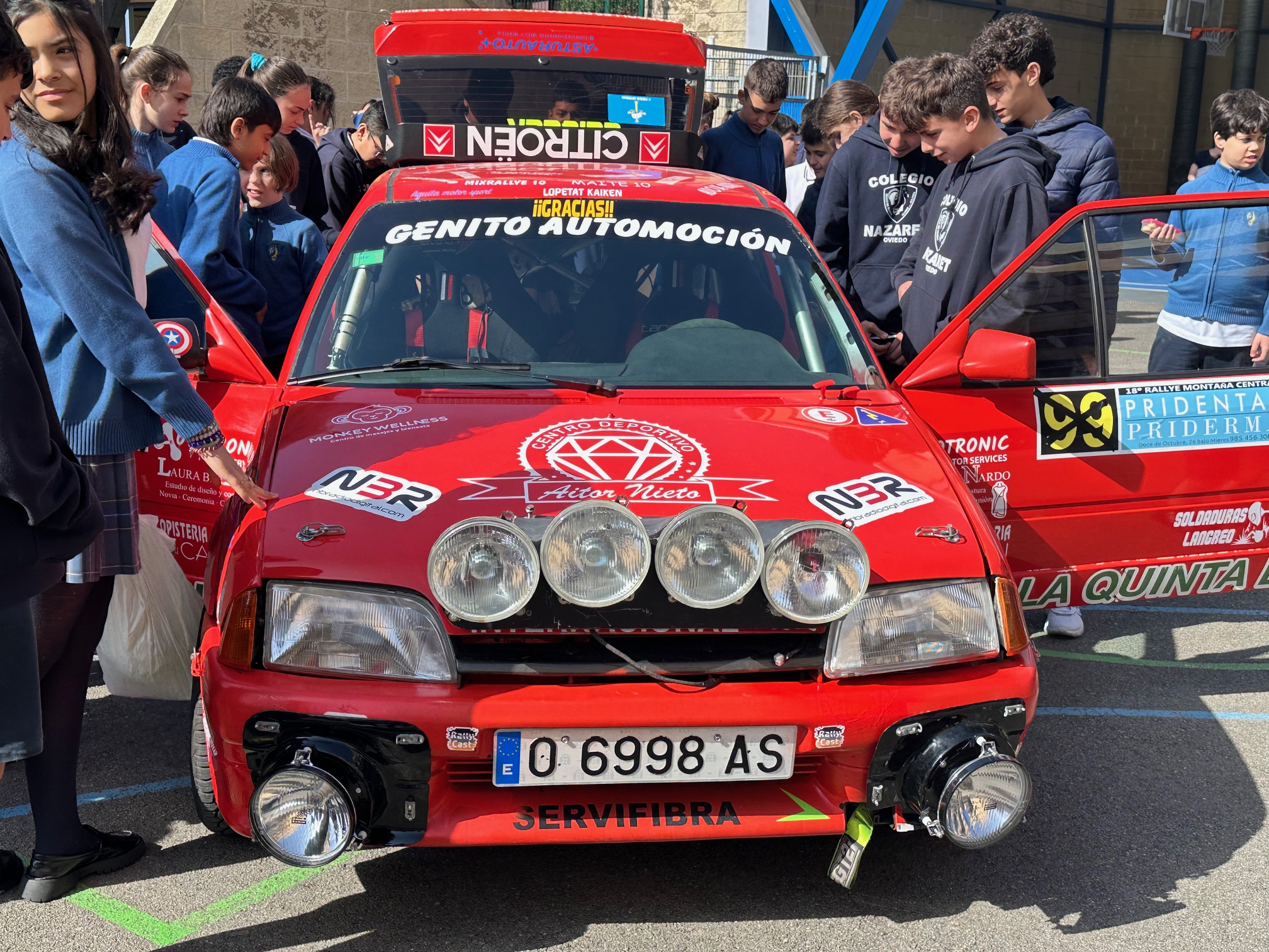 Comenzó enseñándonos un vídeo de algunas de las competiciones en las que participó, donde pudimos ver todos las ganas que pone. Luego nos contó que es la única mujer que compite en Asturias, también nos habló de sus peripecias en las competiciones, averías, vuelcos… Después, los alumnos -que estuvieron muy interesados en el tema-, le hicieron un montón de preguntas, entre ellas qué recuerdos tenía del colegio; lo mejor, nos dijo, los amigos que hizo y que aún conserva y los buenos recuerdos de los profesores. Y terminamos todos en el patio, viendo su coche, que, aunque tiene ya muchos años, está fenomenal; algunos tuvimos la suerte de subirnos a él y ponernos en la piel del piloto y el copiloto. Gracias Vanesa, por tu generosidad al compartir tus experiencias, por la alegría que irradias, por los buenos recuerdos y por ser ejemplo de tesón.