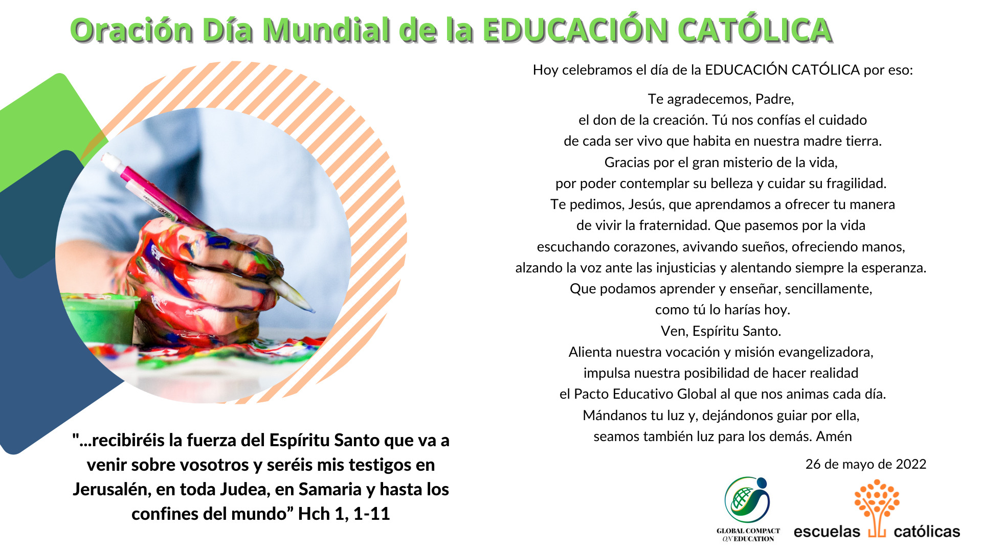 A propuesta del papa Francisco, y como una iniciativa más para llevar a la práctica el Pacto Educativo Global, celebramos el Día Mundial de la Educación Católica cada año a los cuarenta días de la Pascua, en el jueves de la Ascensión, porque es el día en que la misión de Jesús se hace misión de la Iglesia. Este año lo celebramos hoy jueves,26 de mayo.
