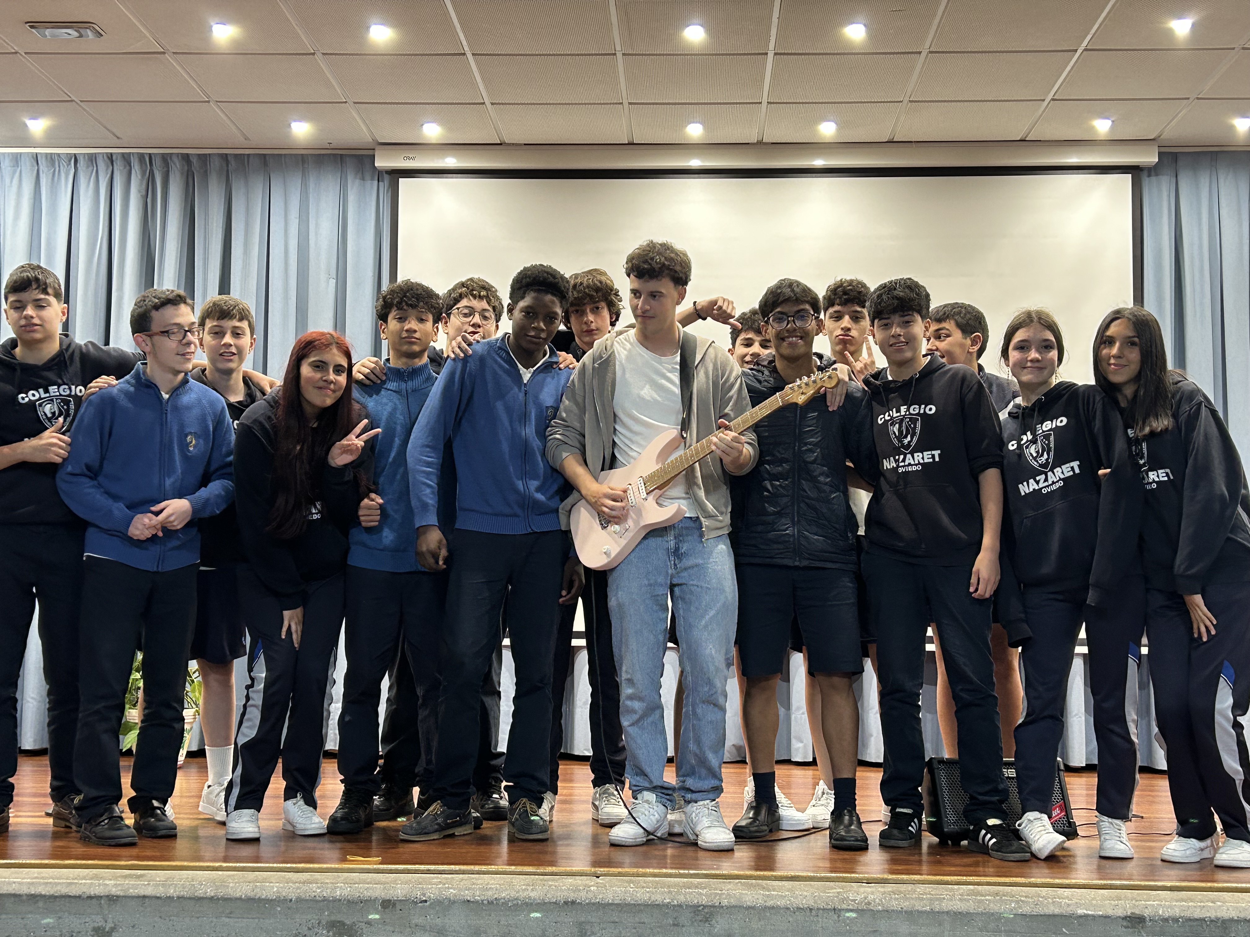 En la segunda ponencia del día, contamos con la presencia del joven músico Daniel Serrano, guitarrista y productor musical. Comenzó contando cómo surgió su vocación musical, sus estudios y primeros pasos, su formación en la prestigiosa productora neerlandesa de WisseloordStudios. Después fue desgranando las fases de la creación de un tema y los secretos del programa que ayuda al compositor. Y pasó a la acción interpretando en directo con su guitarra eléctrica un clásico como “Sultans of swing”, de Dire Straits y “Back in black”, de AC/DC. ¡Cómo disfrutamos de la música en directo! Finalmente, pasó al turno de preguntas de los alumnos, que contestó con sinceridad y amenidad, animando a todos a luchar por sus sueños, con paciencia y pasión. Y, después, fotos, risas y hasta autógrafos… ¡Nos vemos en las RRSS!