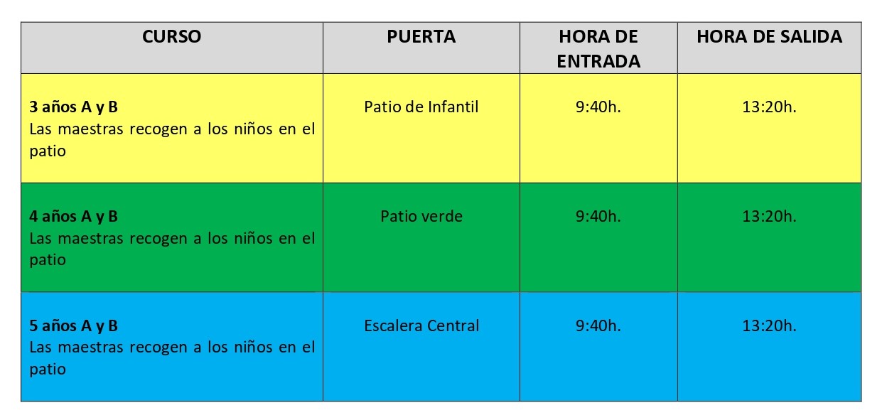 Durante el mes de SEPTIEMBRE, el horario de E. Infantil y E. Primaria será solo de mañanas, de 9:30h. a 13:30h. Los alumnos que utilicen el servicio de comedor podrán recogerse por la entrada del patio entre las 14:00h. y las 15:00h.