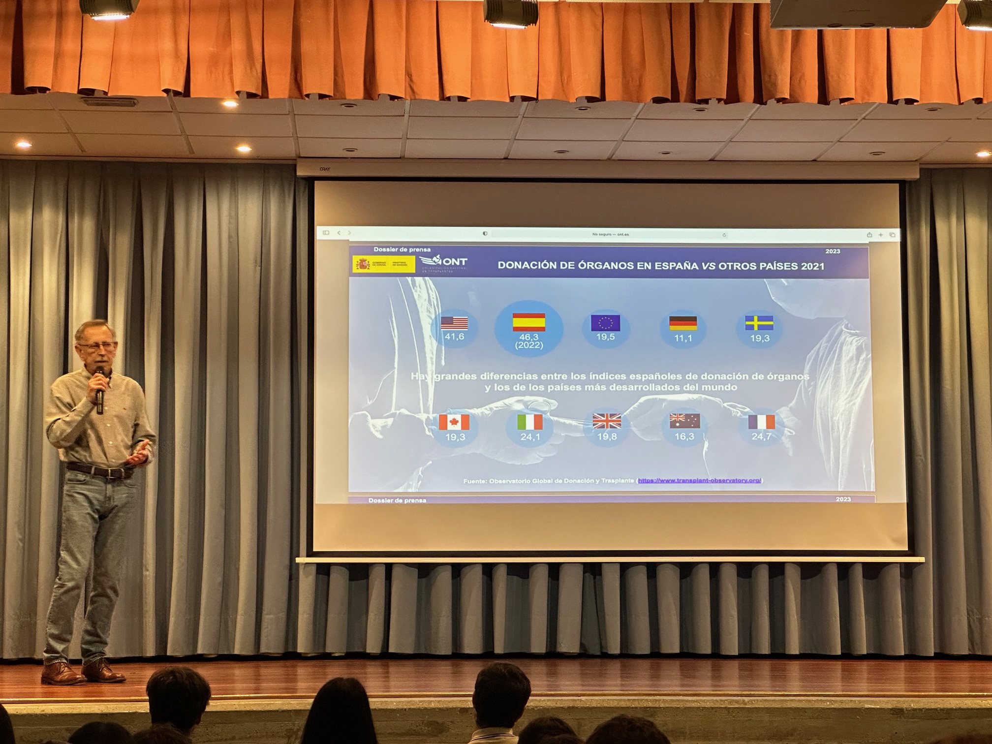 El doctor Ortiz centró su ponencia en dos cuestiones: salud y solidaridad. Partiendo de la definición de lo que salud, incidió en los factores que influyen en la misma: genética, medio ambiente, hábitos saludables y servicios sanitarios, siendo lo que somos, lo que hacemos y dónde vivimos, lo que determina la salud de nuestro cuerpo… y de nuestra mente. Pero, con datos estadísticos y ejemplos personales, nos llevó a la certeza de que lo que hacemos, las decisiones que tomamos son las que nos llevan a tener o no tener buena salud. En la segunda parte de la charla, Juan Ortiz nos contó su experiencia personal como receptor de un riñón trasplantado y como miembro de la ONG ALCER (Asociación de Lucha Contra las Enfermedades de Riñón), a la que le llevó el agradecimiento de devolver a la sociedad lo que esta le regaló. Por último, los alumnos de 3º y 4º de ESO pudieron hacerle a nuestro invitado las preguntas que habían preparado sobre sus diversas inquietudes: los estudios de Medicina, su experiencia como Ginecólogo y Gestor Sanitario, los pormenores de los trasplantes y las donaciones, los momentos mejores y peores de su trayectoria profesional… Un montón de inquietudes que el doctor Ortiz respondió sorprendido del interés mostrado por los presentes.