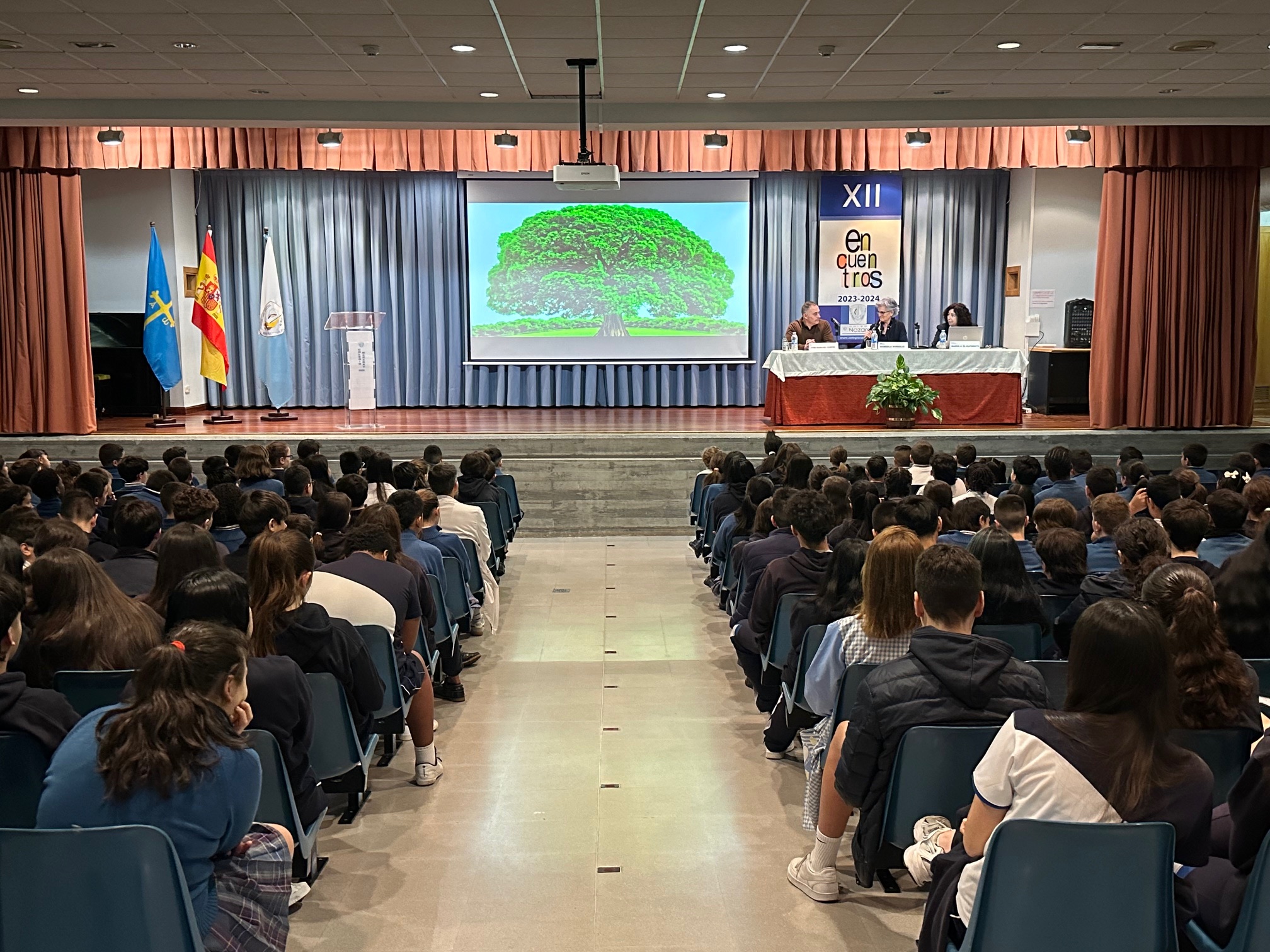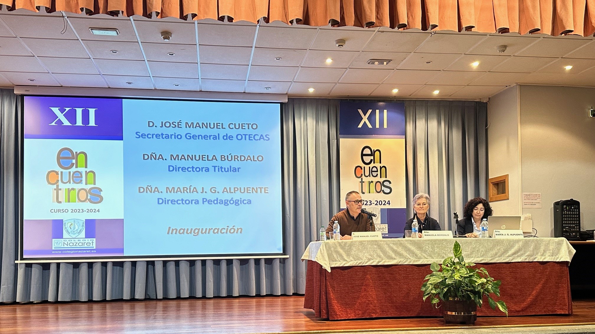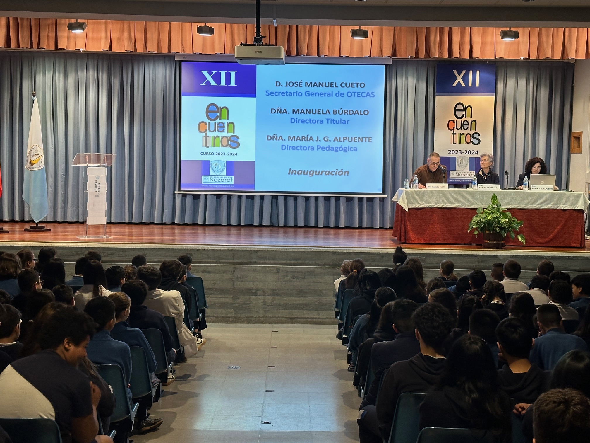 Este año, tuvimos el honor de contar con la presencia de D. José Manuel Cueto, secretario general de OTECAS, quien recordó su paso por el colegio como profesor y nos habló de las pruebas PISA y las buenas calificaciones en ellas de los colegios concertados como el nuestro. A continuación, la directora pedagógica, Dña. María J.G. Alpuente, agradeció a profesores y alumnos su implicación en la preparación de estos Encuentros y a todas las personas e instituciones que este año y en los años pasados, han participado generosamente para “ensanchar nuestra mirada y nuestras mentes”. Tras ello, la directora titular, Dña. Manuela Búrdalo, nos recordó dos fechas importantes de esta Semana: el 19 de marzo se celebran los 149 años de la fundación del Instituto Hijas de María Madre de la Iglesia y el 21 de marzo se conmemoran los 20 años de la beatificación de su fundadora, Madre Matilde Téllez.