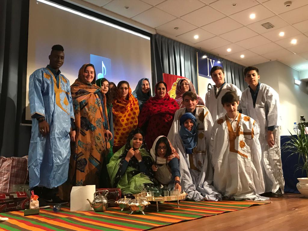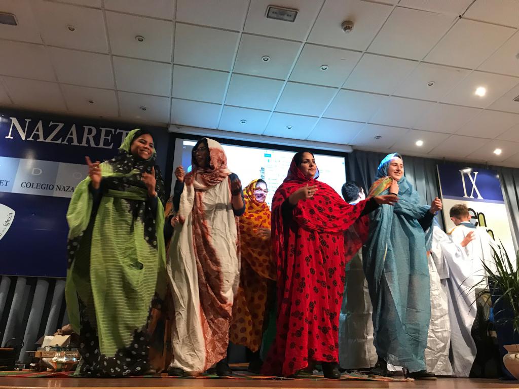 Fue una charla un poco especial. Empezaron contándonos dónde viven los saharauis y cuál es su situación política y social en la realidad, para lo cual nos mostraron un vídeo. A continuación, nos relajamos con la ceremonia del té y nos enseñaron cómo poner sus trajes típicos. En este momento de la charla, nuestros alumnos participaron aprendiendo a ponerse los trajes típicos y tomando el té como es costumbre. A continuación, siguiendo la música saharaui, algunos alumnos también aprendieron alguna coreografía que practican las mujeres saharauis.