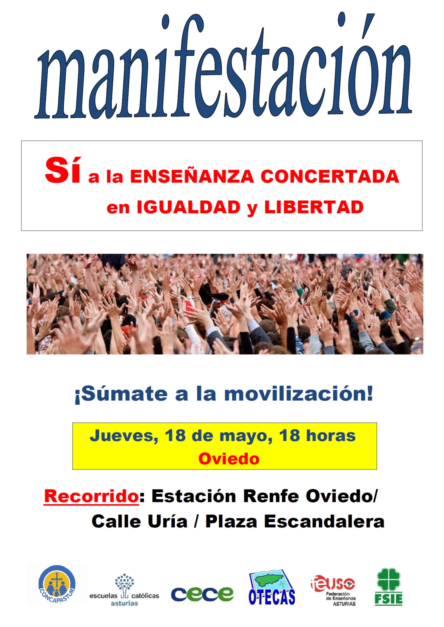 El próximo jueves, 18 de mayo, tendrá lugar una MANIFESTACIÓN por los derechos de la enseñanza concertada y la libertad de elección de centro para la educación en Asturias. Está convocada para salir de la Estación de Renfe de Oviedo a las 18 horas y discurrirá por la calle Uría hasta la Plaza de la Escandalera, donde se leerá un manifiesto.