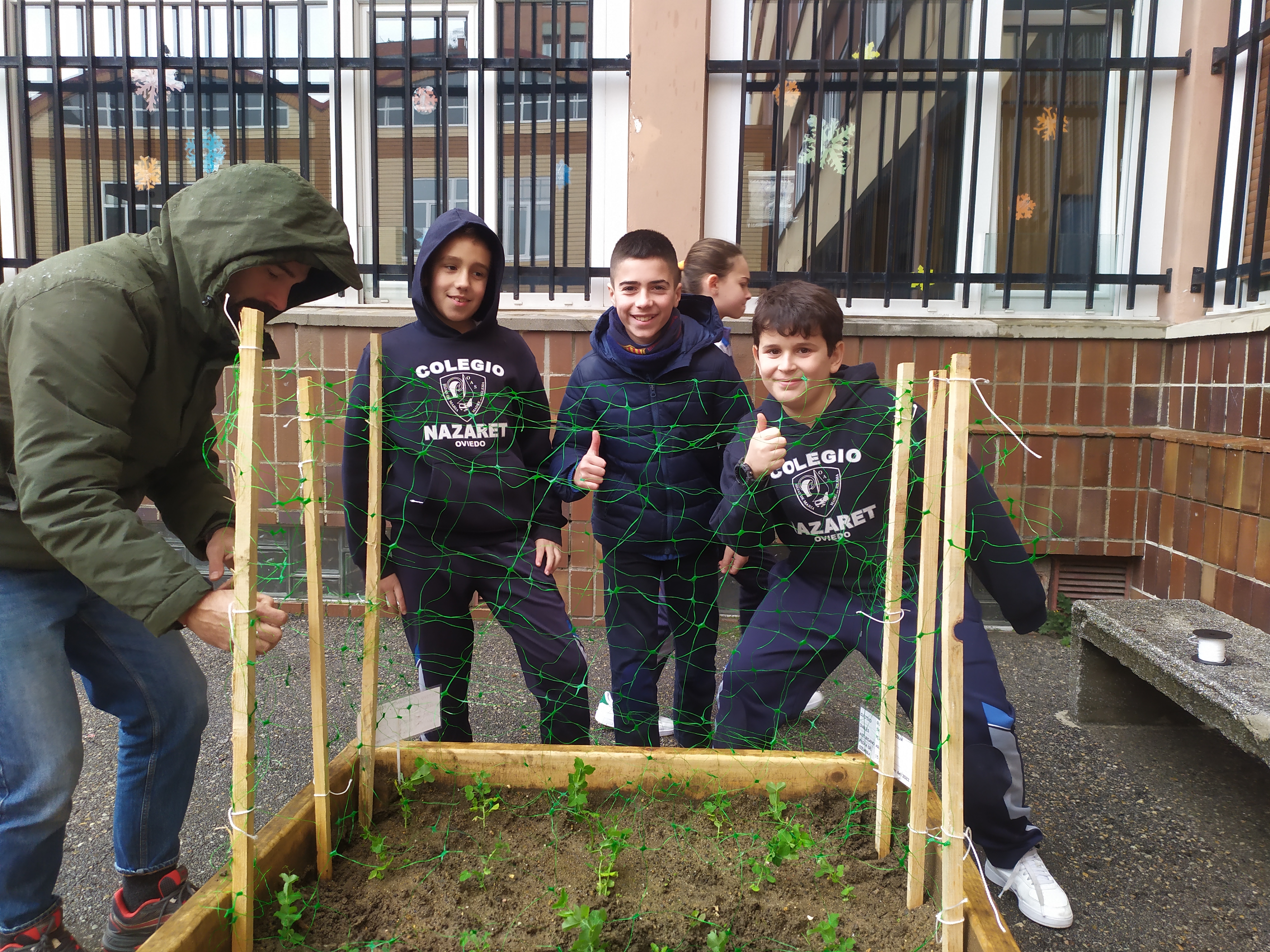 Además, aprovechando una pequeña ventana de buen tiempo, hemos puesto los tutores y la red a nuestros guisantes para que comiencen a trepar por ella.