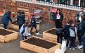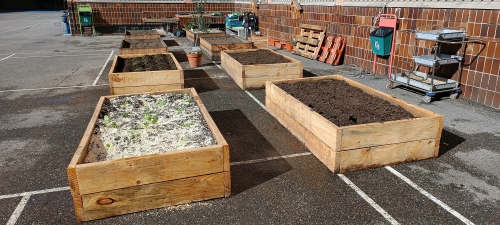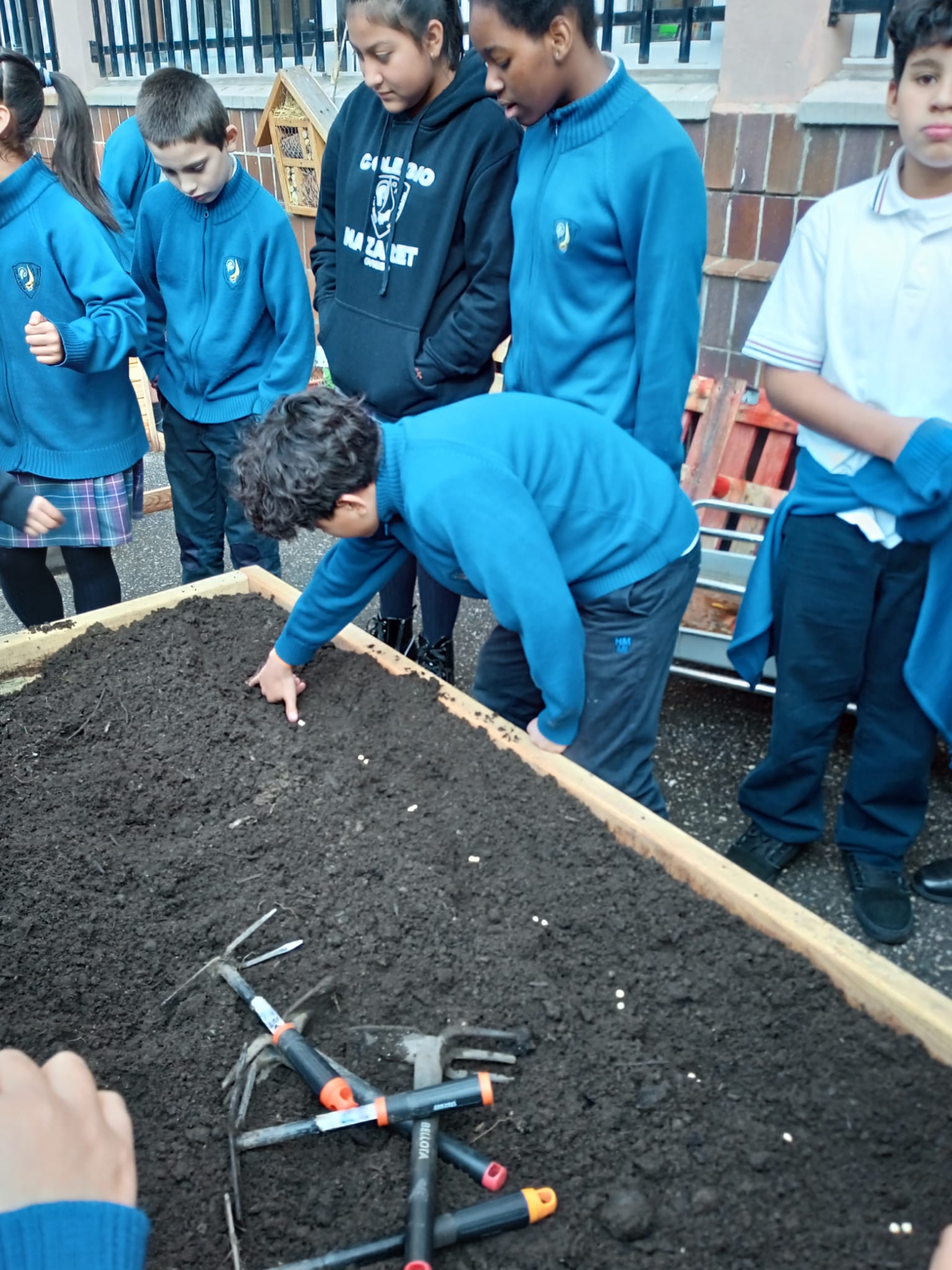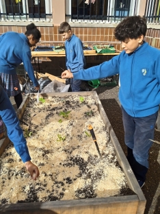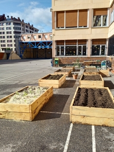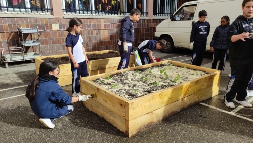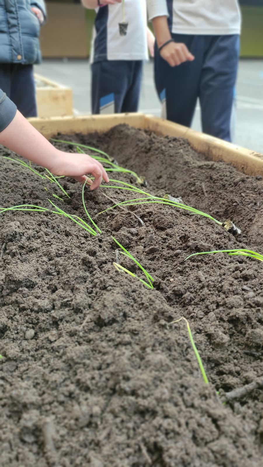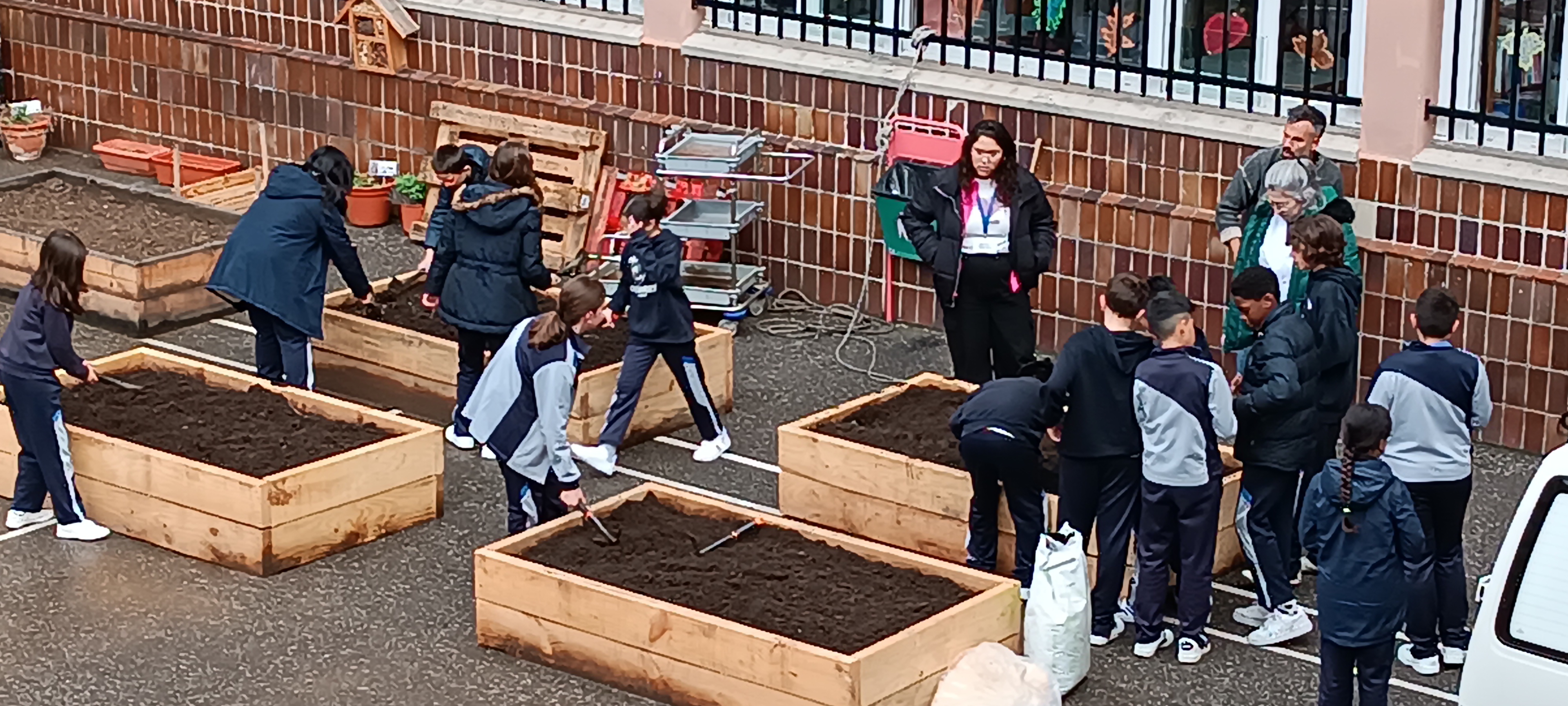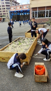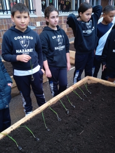 Tras la presentación de los conceptos teóricos, aprovechamos el buen día de este jueves, para sembrar y trasplantar: repollo, zanahorias, berza, cebolleta, guisante, ajo y rabanito. Estas especies se adaptan a las bajas temperaturas, no obstante, las hemos protegido con un ligero acolchado de serrín.