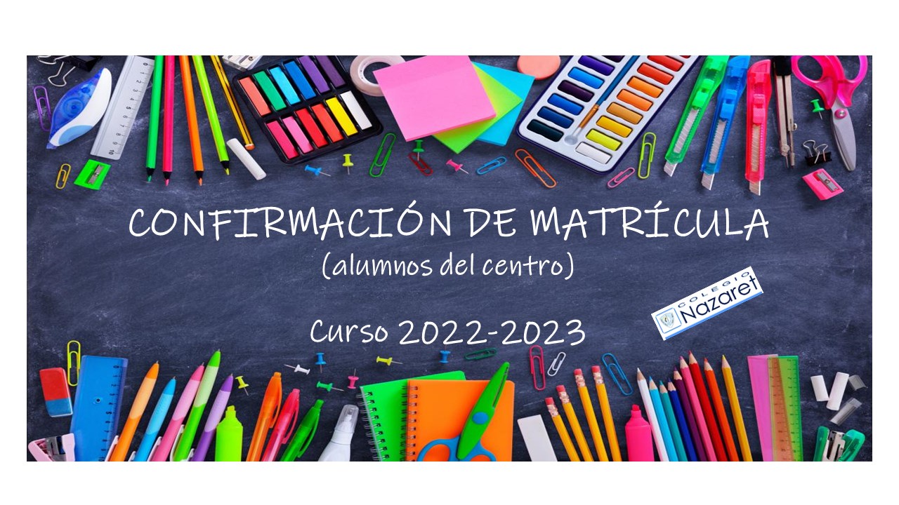 El documento de confirmación de matrícula se ha enviado a las familias mediante comunicado (también puede descargarse aquí). Debe enviarse rellenado y firmado a: confirmaciones@colegionazaret.es