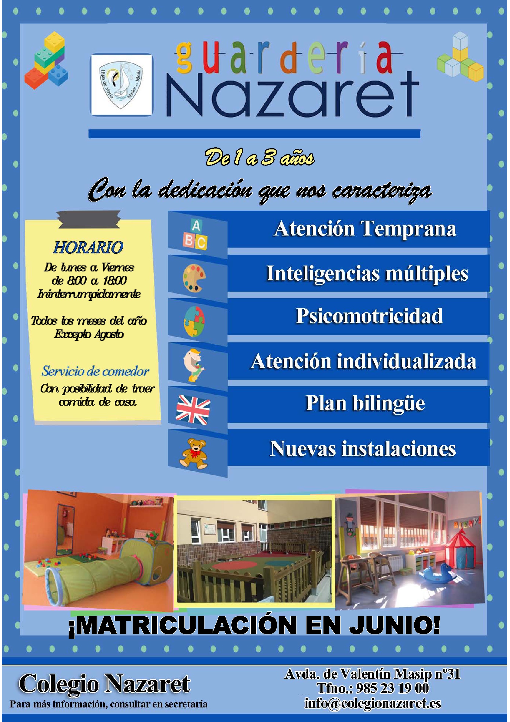 La Guarderia Nazaret (de 1 a 3 años) abre su plazo de matrícula para el curso 2018/2019. Nuestro programa de educación se basa en la estimulación temprana, desarrollando la psicomotricidad mediante actividades lúdicas para lograr una mayor maduración general. Disponemos de pizarra digital para iniciarnos en las nuevas tecnologías y trabajamos desde el primer momento nuestro plan bilingüe mediante juegos y diversión.