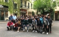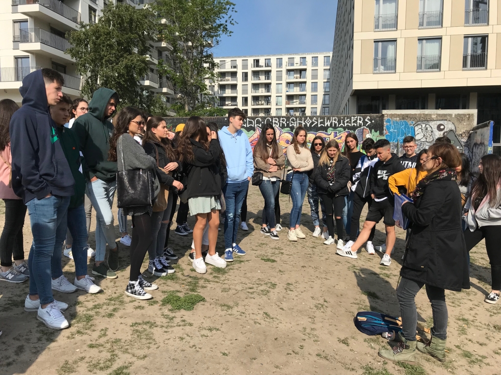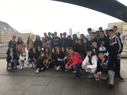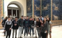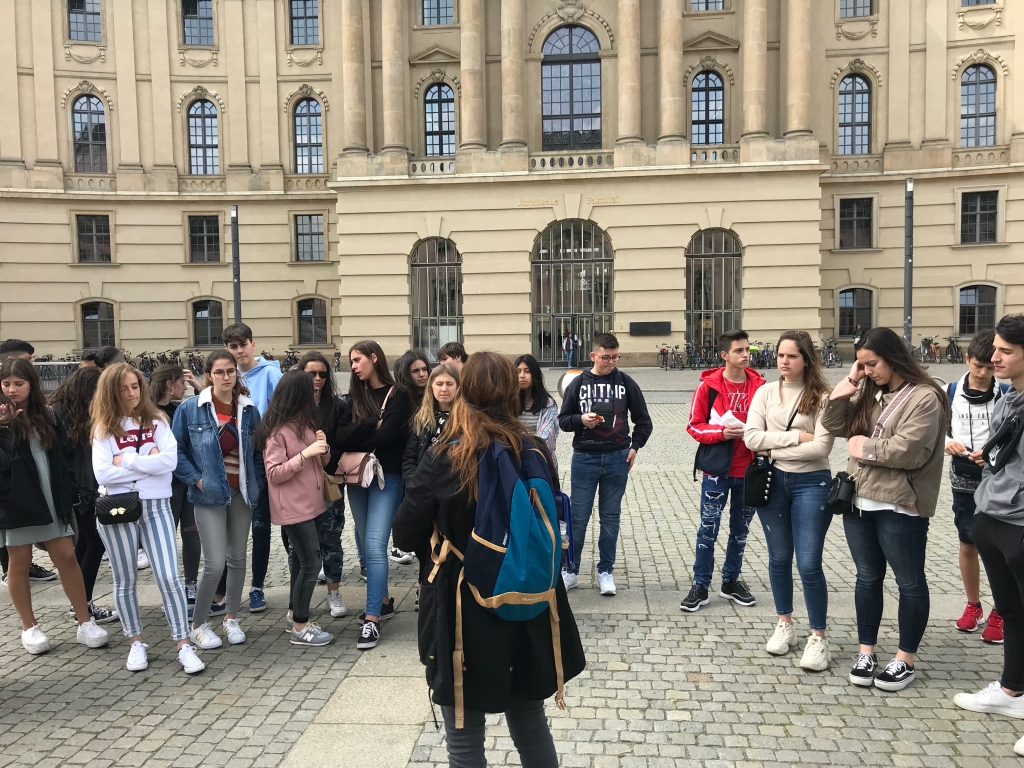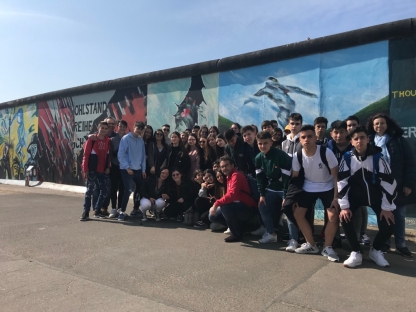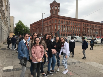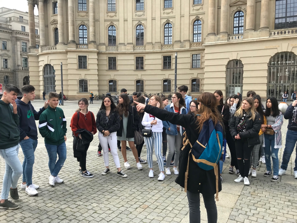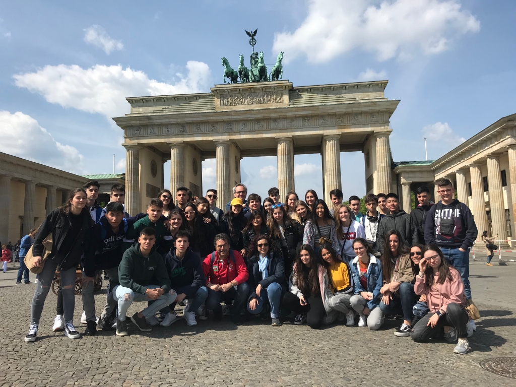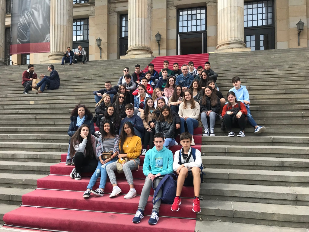 La explicación, junto al calor del día, fueron un termómetro para saber el número de horas de sueño del día anterior. Luego anduvimos hasta la Ostbahnhof, la estación del este, que nos llevó a Alexanderplatz y de ahí por Unter den Linden hasta la Puerta de Brandeburgo. Recorrimos más monumentos como la Universidad de Humboldt y la plaza en la que se quemaron los libros que los nazis consideraban "degenerados"; hay un hueco acristalado en el suelo por el que se ven unas estanterías vacías para que nadie olvidé que eso ocurrió. Finalmente, llegamos a la Isla de los Museos donde visitamos con audioguía el de Pérgamo que guarda algunas de las mayores joyas arqueológicas de la Historia como Las Puertas de Ishtar. Lucía se había despedido no sin antes recomendarnos para comer el Barrio judío. Después, dejados de la mano de nuestra guía, nos aventuramos en Hackesche Hofe, patios interiores aprovechados en la actualidad para tiendas y bares. Luego cogimos el metro hasta Schlesisches Tor para pasear otra vez junto al muro y hacernos una foto con el grafiti del "piquín" entre Honecker y Breznev . Un poco de esparcimiento en el Mercedes Arena y las huestes, ya sin sentir las piernas, volvieron en grupos desgranados al Hostal. Muchos hablaban de que estaban agotados. ¡Ja! Revivirán cual ave fénix y de nuevo la noche será breve.