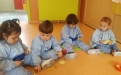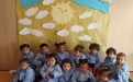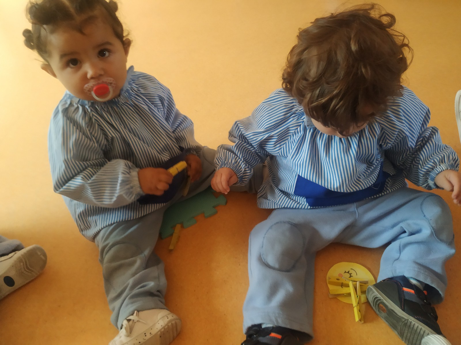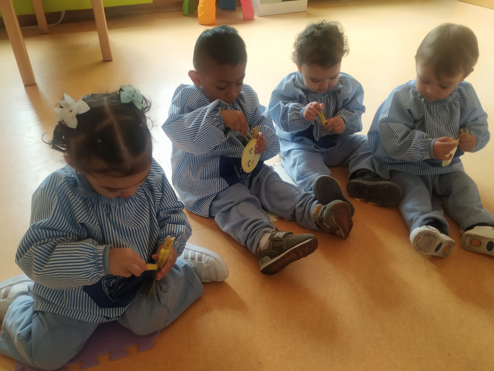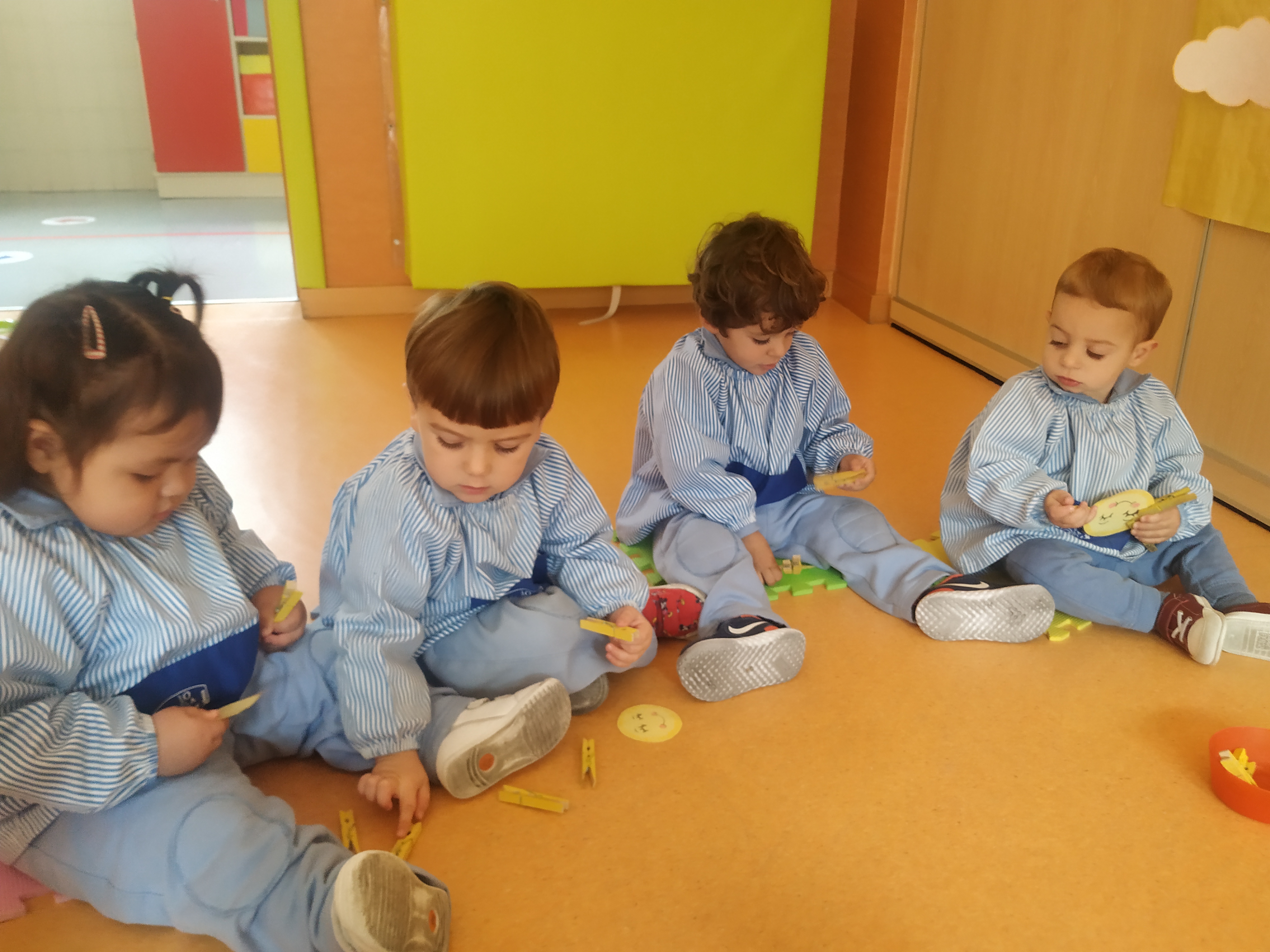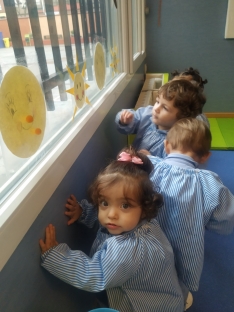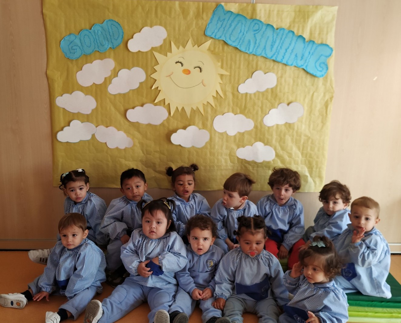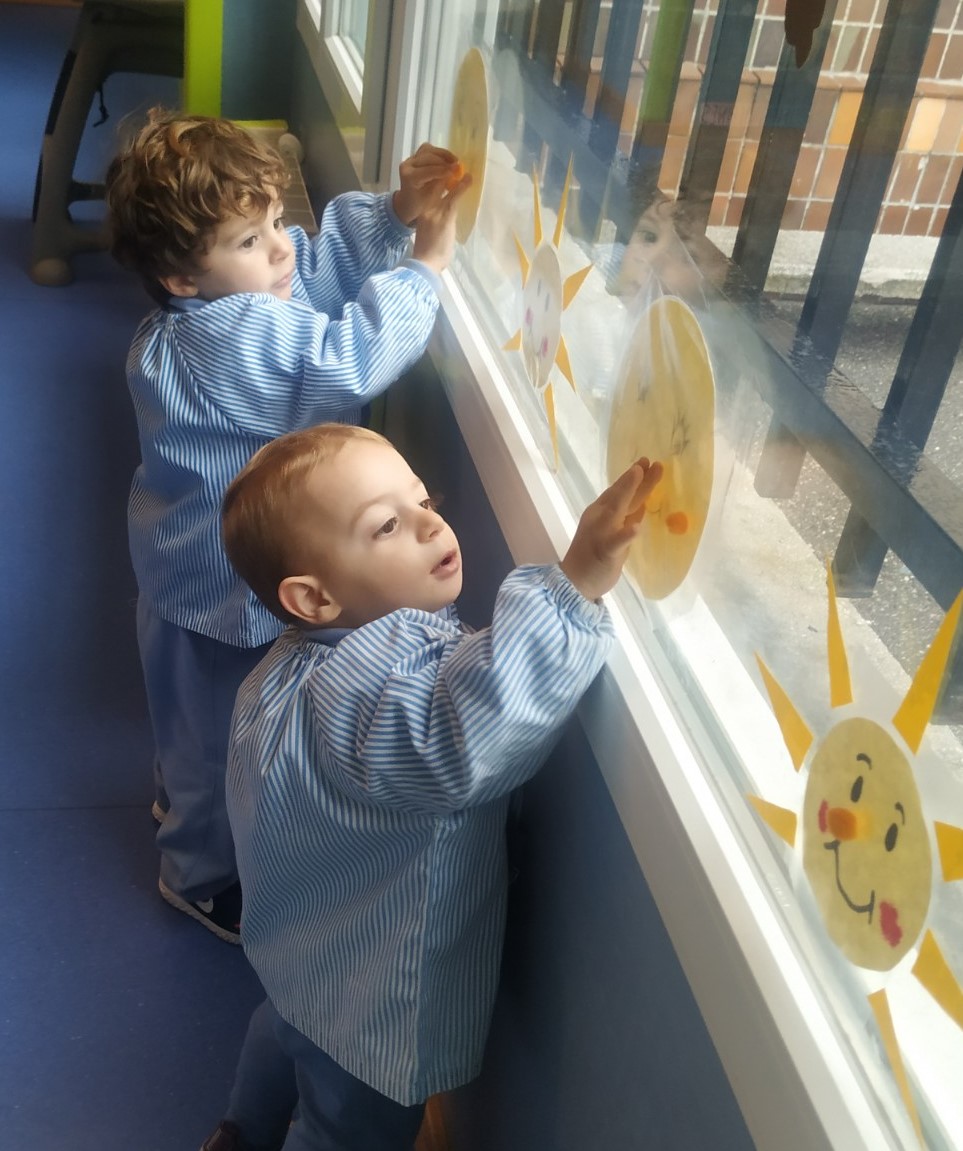 En la guardería Nazaret están trabajando los conceptos temporales básicos, día-noche, y en estos días han centrado la atención en el Sol, haciendo un mural practicando la expresión en inglés "Good morning", y lo que vemos cuando miramos durante la mañana al cielo, básicamente sol y nubes. También aprovechan el concepto Sol para trabajar la motricidad fina, pegando y quitando pequeños pompones en los soles de las ventanas y colocando los rayos en los soles de cartulina.