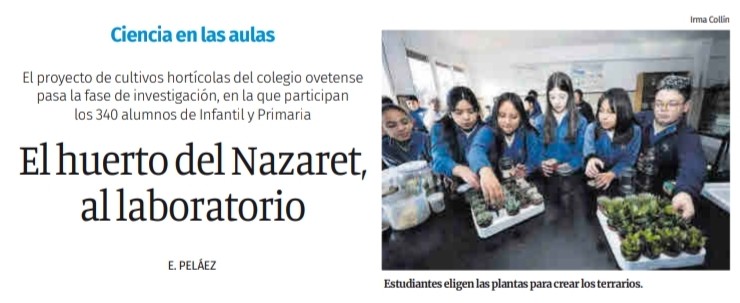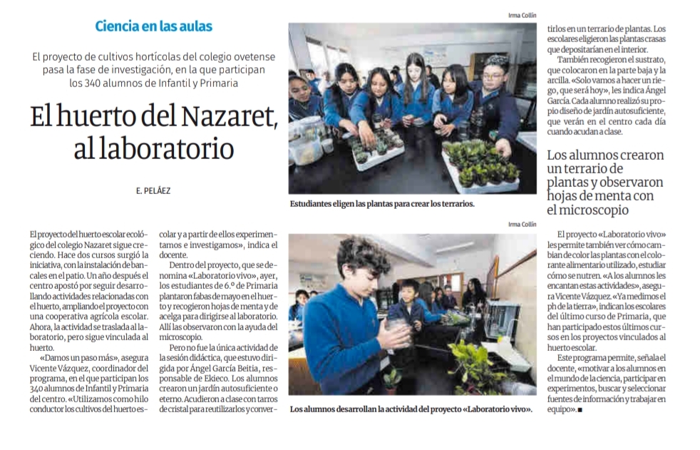 Nuestro proyecto de huerto ecológico escolar, "LA HUERTINA DEL NAZARET", no deja de crecer desde hace dos años. Este curso ha dado un paso más hacia el proyecto "LABORATORIO VIVO". Con este programa, nuestros 340 alumnos de E. Infantil y E. Primaria se inician en el mundo de la ciencia desde el huerto escolar hasta el laboratorio, participando en experimentos, seleccionando fuentes de información y trabajando en equipo. ¡Nuestros futuros científicos no pueden estar más motivados!