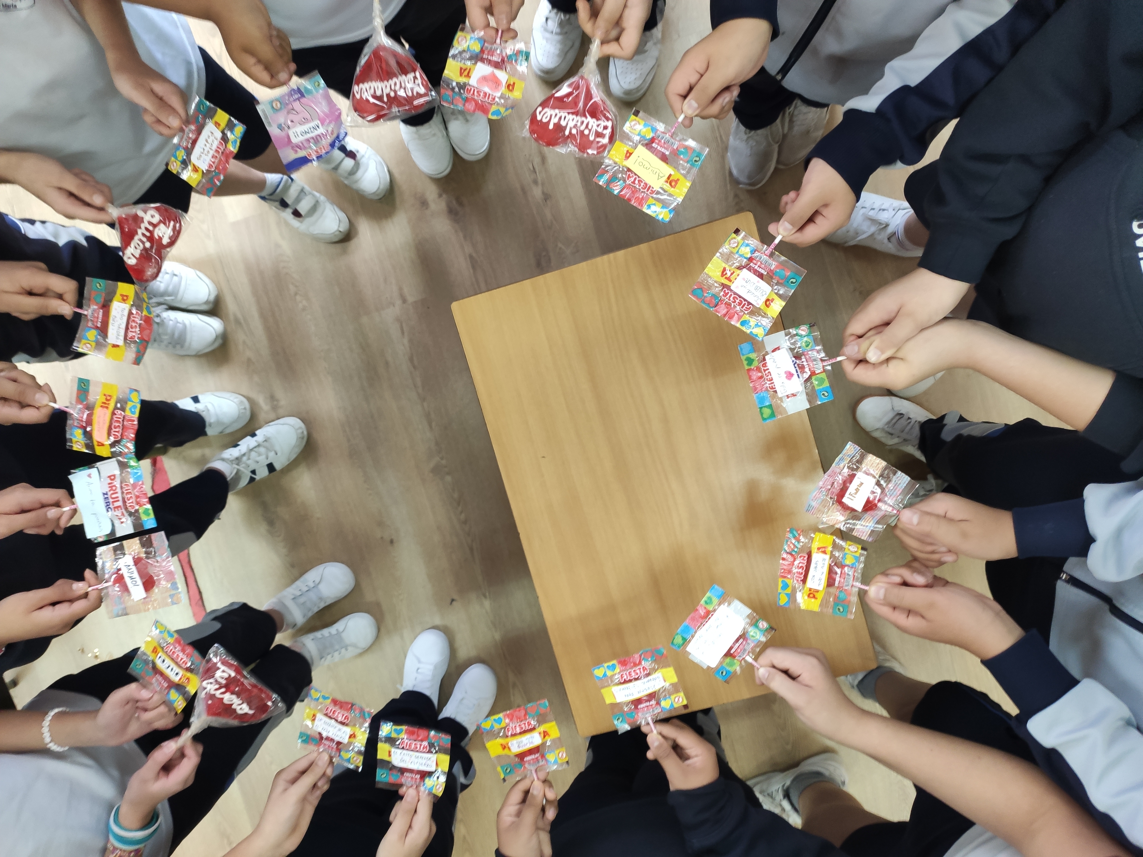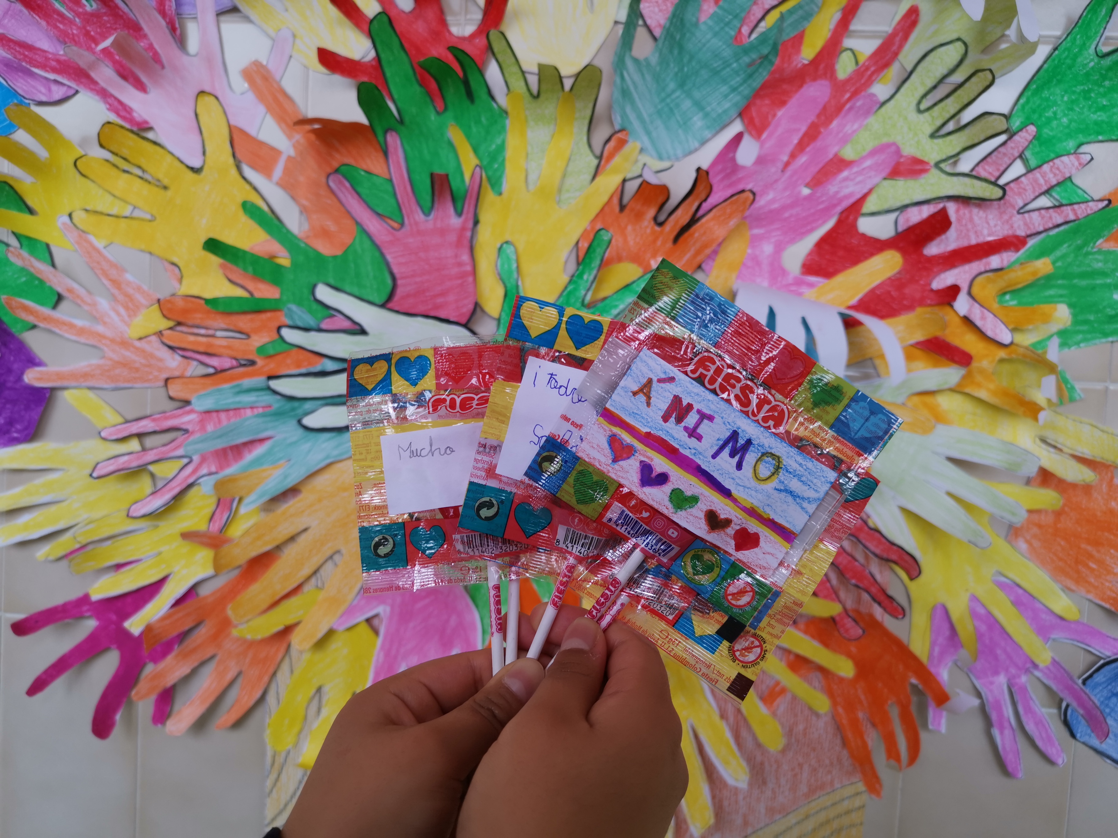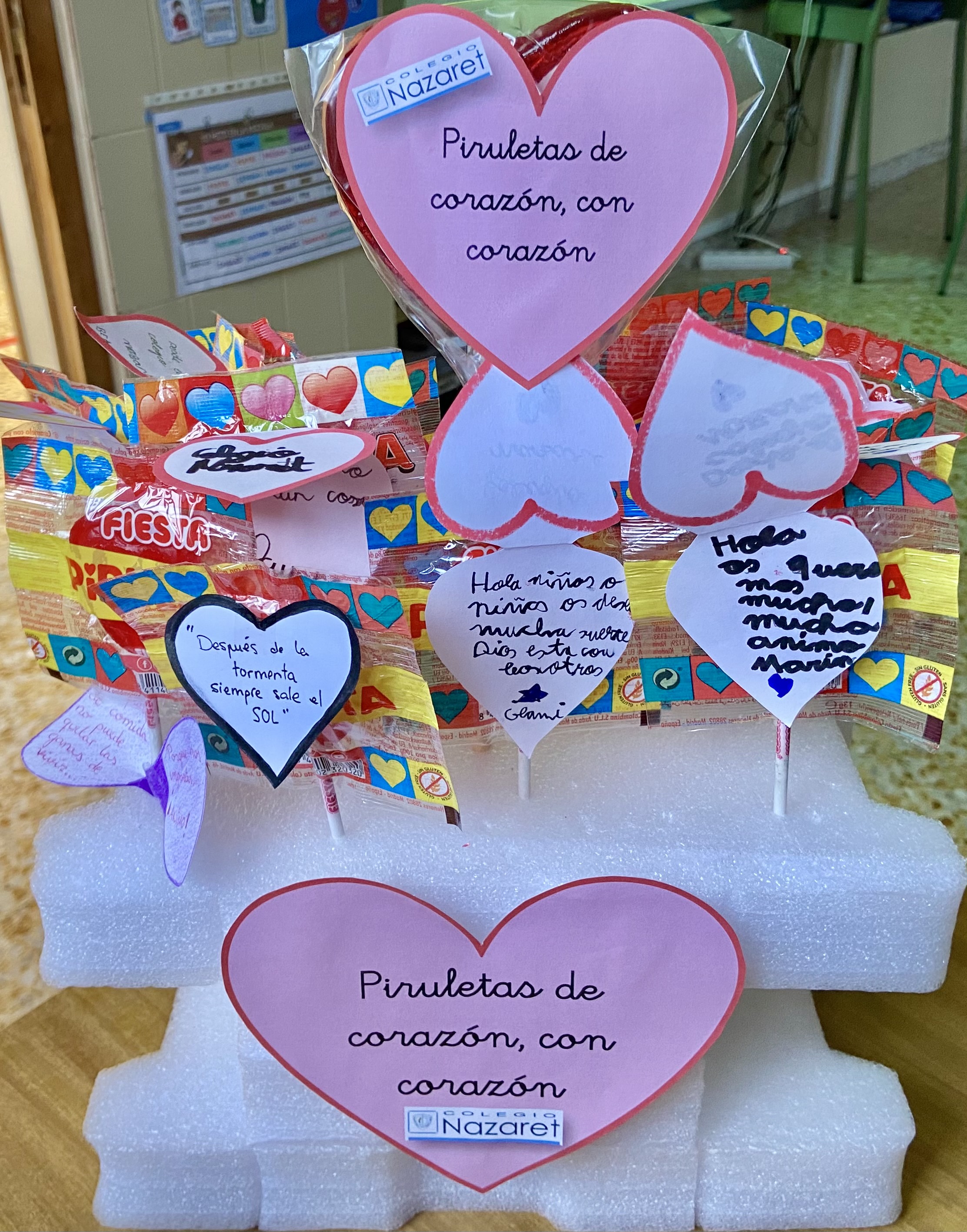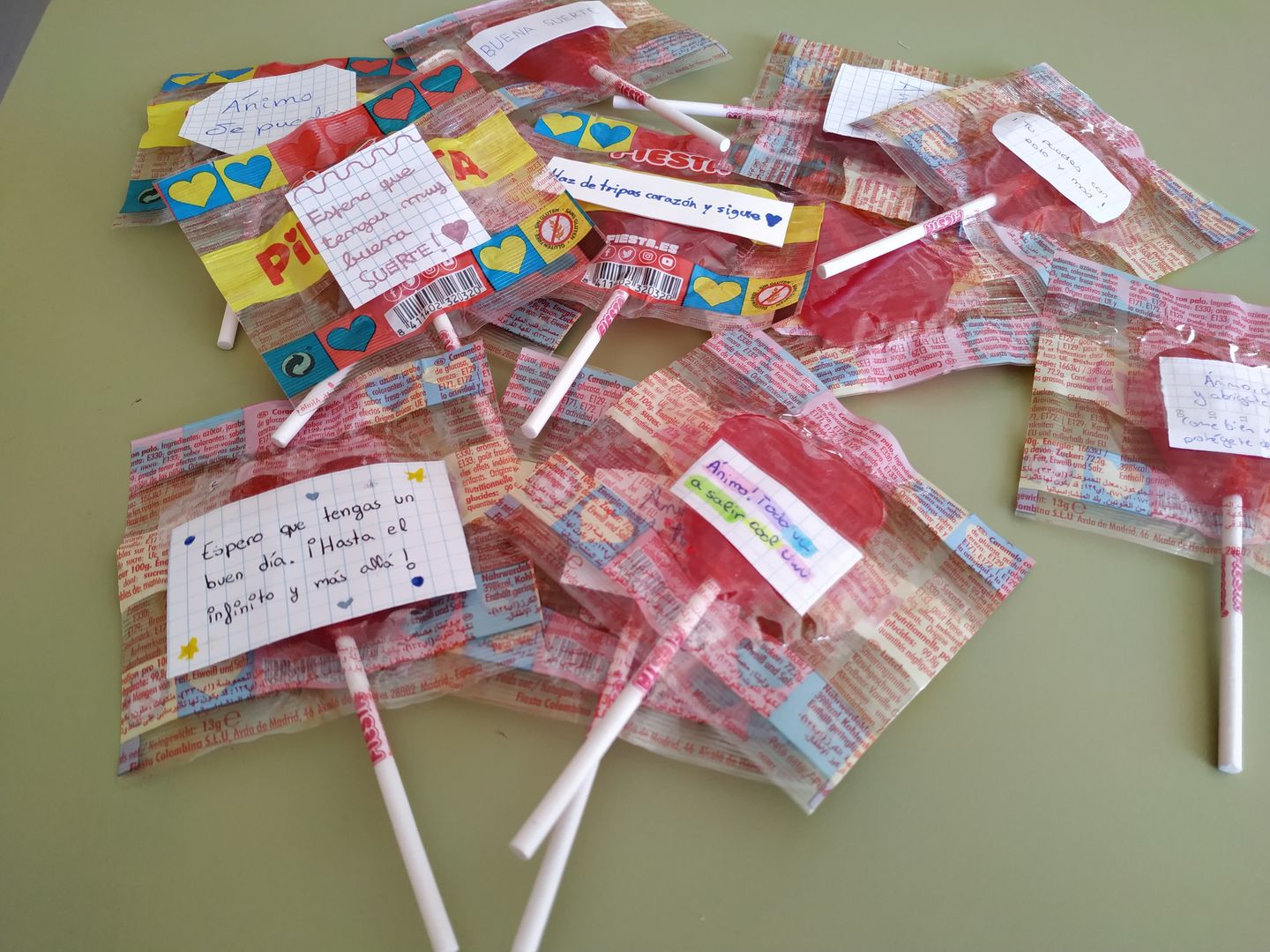 Nuestra colaboración consiste en que cada alumno traiga una piruleta en forma de corazón (de tamaño mediano o grande) con un mensaje. Estas serán entregadas tanto a los comensales como a las familias que van cada tarde a recoger alimentos. Os animamos a que, junto con vuestros hijos, escribáis el mensaje de ánimo.