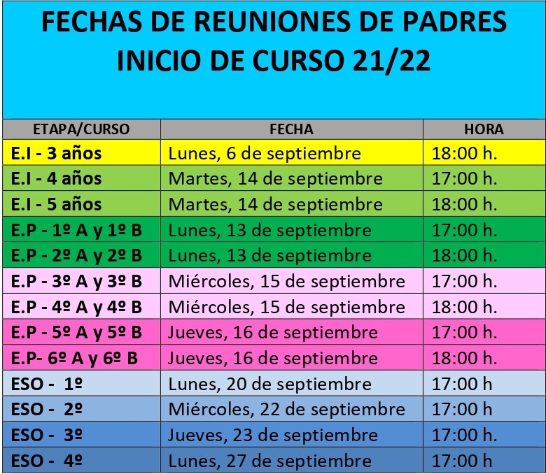 Las reuniones de inicio de este curso para las familias tendrán lugar en el salón de actos, donde se aplicarán las medidas de prevención e higiene igual que el año pasado: distancia de seguridad, mascarilla obligatoria y uso de gel hidroalcohólico. Consulta las fechas y horarios en el siguiente cuadro: