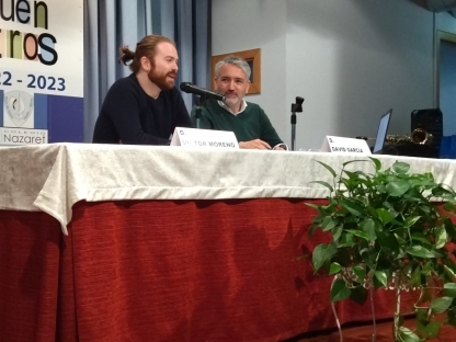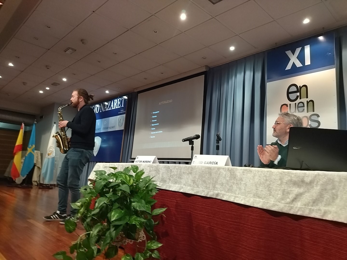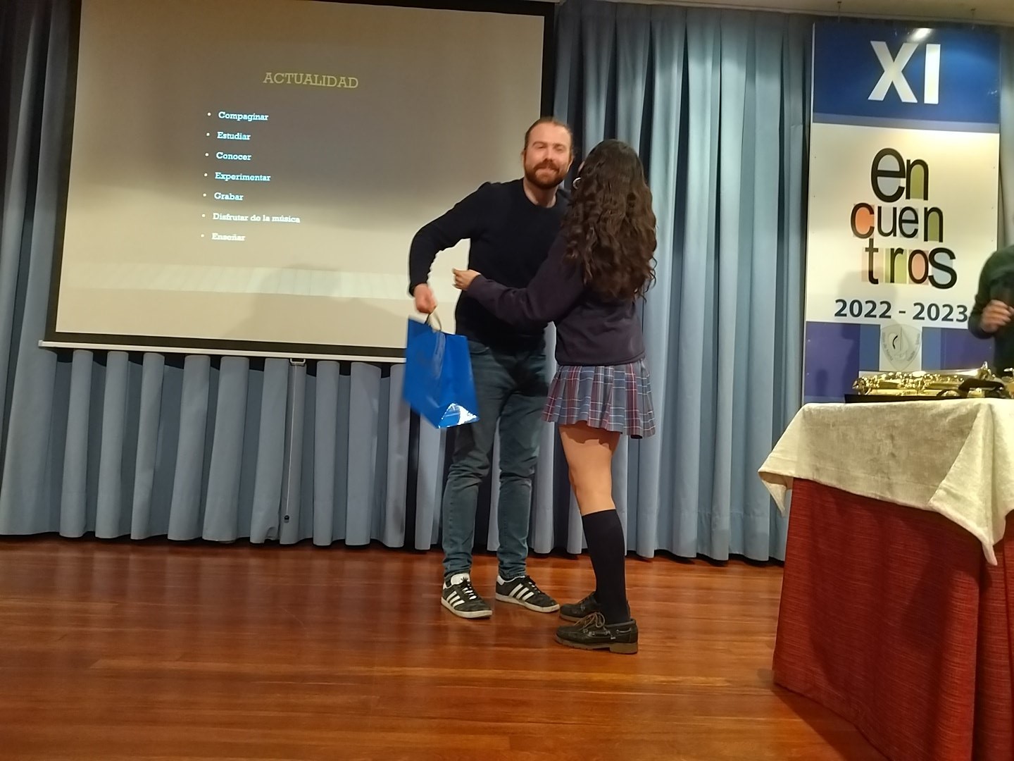 En el primer “Encuentro” de hoy, contamos con la deseada presencia del músico Víctor Moreno Gómez, a quien ya conocíamos, tanto alumnos como profesores, de sus recientes prácticas del Máster del Profesorado. El recuerdo que nos dejó no pudo ser mejor y, en la charla de hoy, con el público completamente entregado, nos ofreció su propia versión de una vida llena de música. Nos contó las diferentes etapas vividas a lo largo de una carrera musical, anécdotas, objetivos musicales, vivencias, experiencias, dramas, etc. A lo largo de toda la charla, la música funcionó como nexo de unión y convivencia, donde se generan amistades para toda la vida y donde se plasma la disciplina y el esfuerzo que este arte representa. Un camino complejo, pero lleno de momentos especiales, en los que las experiencias y los momentos vividos le hicieron crecer como persona. En definitiva, su vida es la de un músico que siente amor por este arte y que siempre luchó por y para cada uno de esos momentos.