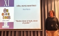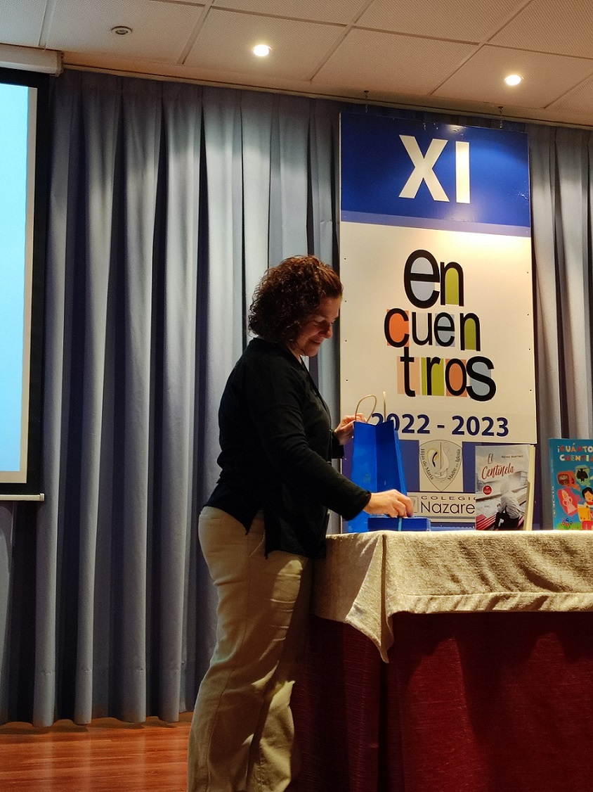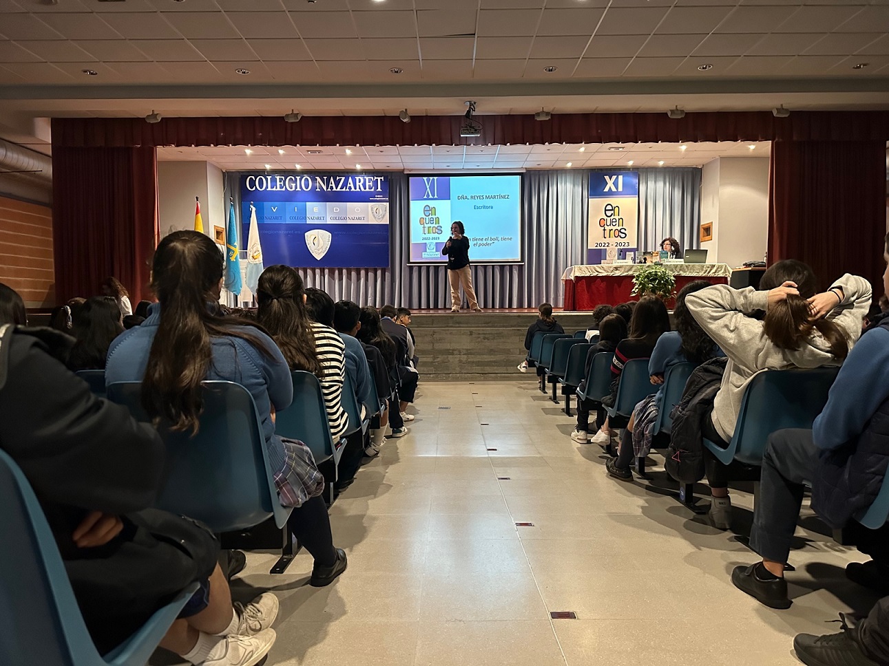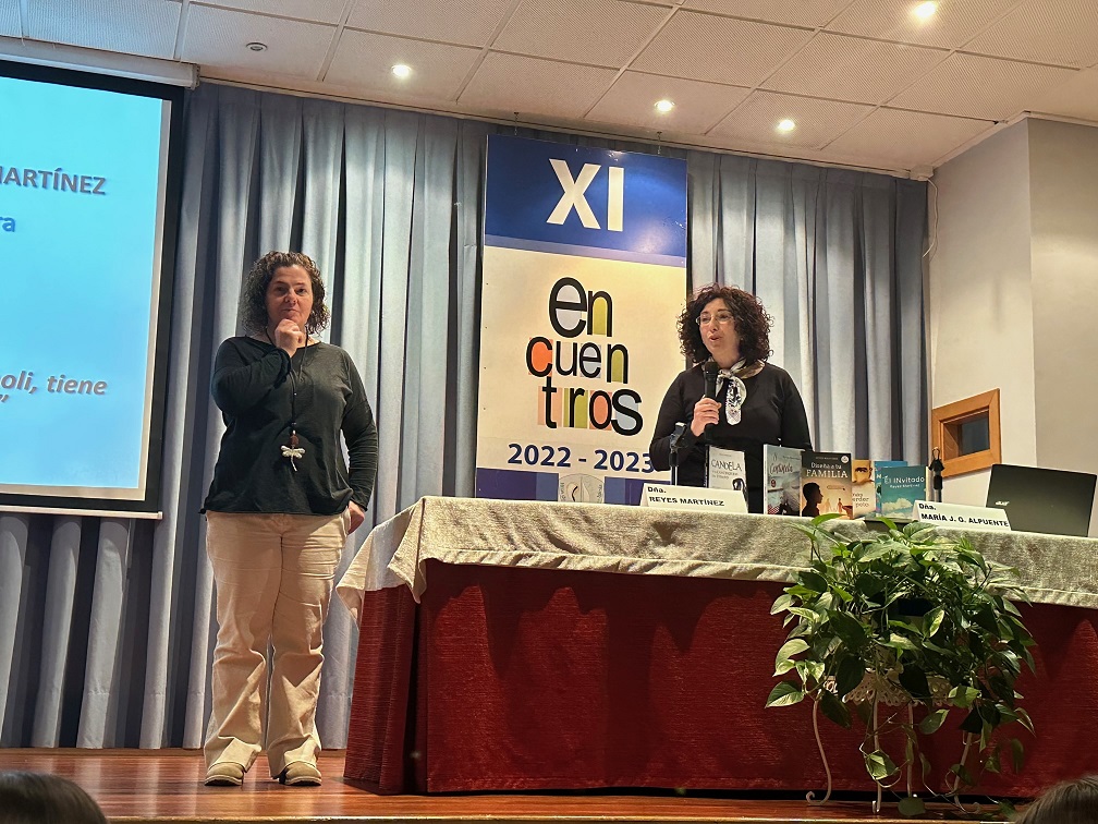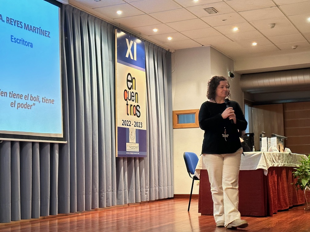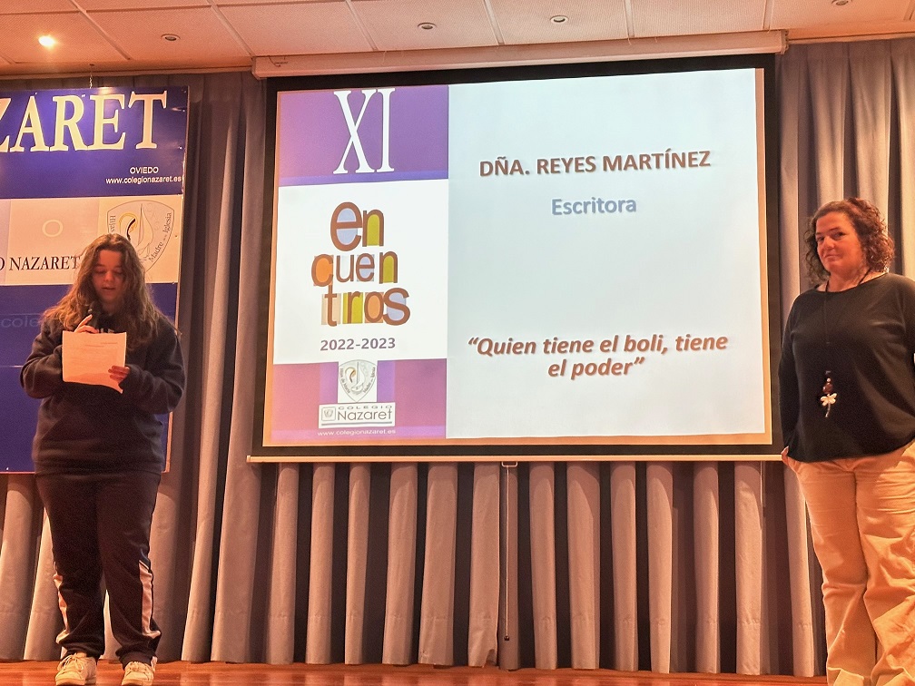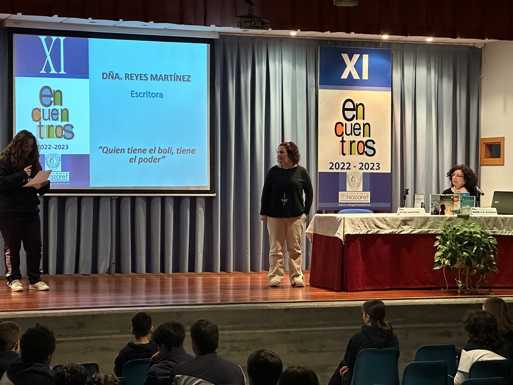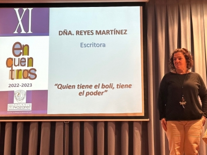 Además, en el primer “Encuentro” de hoy, contamos con la presencia de la escritora madrileña Reyes Martínez Hernández, la cual es técnica especialista en Radiodiagnóstico y compagina su trabajo en el hospital, con la labor de ser ama de casa, madre de tres hijos y su afición por la escritura. Tiene muchas obras publicadas, tanto para niños como para público juvenil y adulto. Reyes Martínez comenzó diciéndonos que ya desde que tenía ocho años había decidido ser escritora, animada por su profesora de Lengua. La primera novela la comenzó a escribir porque a su hijo mayor le gustaban mucho las historias de intriga; y así surgió Candela y toda una saga de una niña que en algo se parece a la autora (algo rebelde, pero de buen corazón). Animada por su madre, se decidió a autoeditar el libro, y así ha sido hasta ahora, pero su último libro ya lo editará una conocida editorial. Nos enseñó que para ser escritora debes de tener imaginación y constancia; así, escribe todos los días, cuando tiene tiempo libre, pues tiene muchas ocupaciones, aunque ella dice que no le gusta decir “no tengo tiempo” o “no puedo”. Otra cosa que nos dejó clara es que ella nunca escribirá por encargo; le gusta escribir sobre lo que quiere, y le surgen historias donde menos se lo espera. A veces también se queda bloqueada, por eso tienen suele tener dos historias abiertas. Para finalizar, nos habló de El centinela, una novela juvenil sobre el acoso, basada en hechos reales y donde nos anima a todos (niños, profesores padres o espectadores) a ponerse en la piel de los demás antes de decidir.