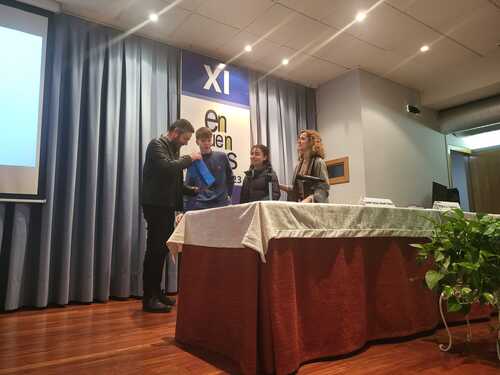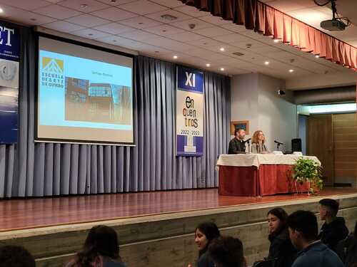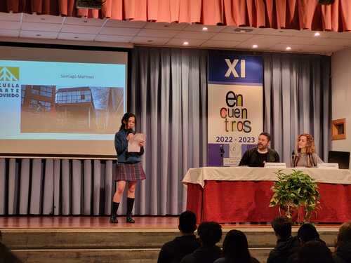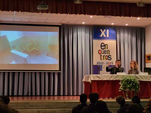 El primer "Encuentro" del día de hoy nos llevó al mundo de las artes y la cultura, para ello contamos con la presencia de D. Santiago Martínez, Profesor de Artes Plásticas y Diseño, Crítico de Arte y Comisario. El interés de Santiago por visibilizar el Arte y los artistas, tanto a través de la Historia más alejada a nosotros como a la más próxima y contemporánea, fue el tema de la ponencia que presentó: “Sobre mujeres artistas en la Historia”. Nuestro ponente ha compartido su capacidad de mirar y enseñar a mirar el Arte desde una posición muy cercana y didáctica. El alumnado de 3º y 4º ESO escuchó atentamente todas sus explicaciones sobre el tema presentado y también tuvo la oportunidad de conocer el desarrollo y preparación de su último proyecto “Poéticas del espacio” expuesto actualmente en Santander, así como del resto de sus facetas profesionales. Como sorpresa final, Santiago obsequió a dos de nuestros alumnos con dos ejemplares editoriales ilustrados por Iranidis Fundora, todo un broche de oro para esta más que interesante ponencia.