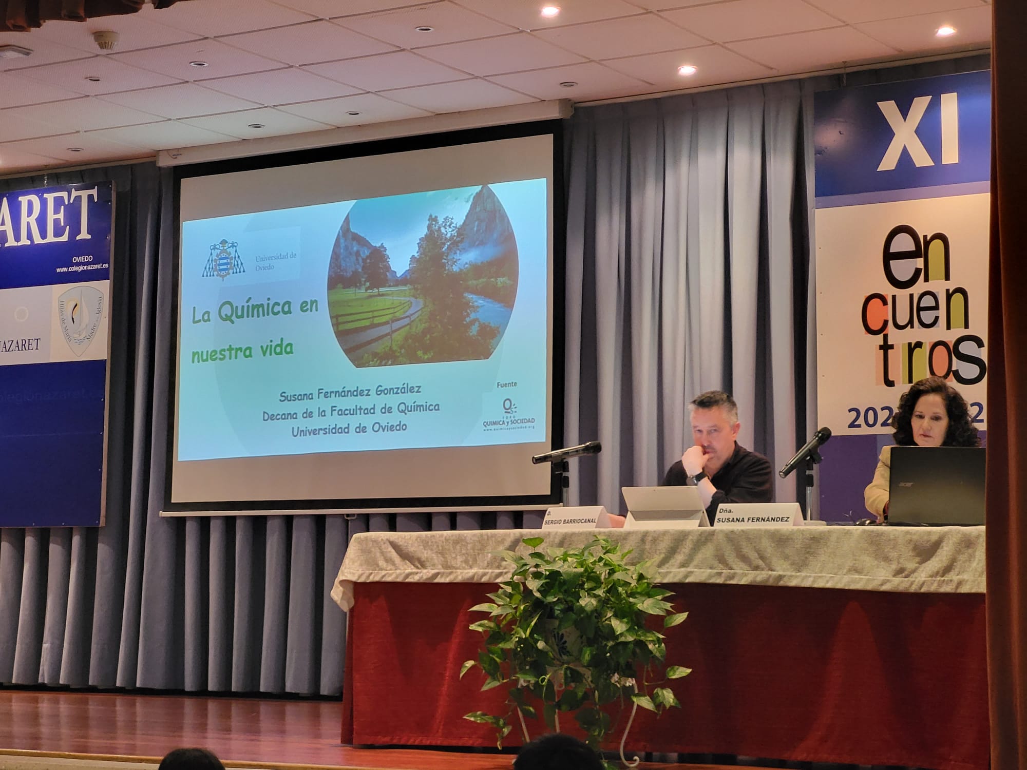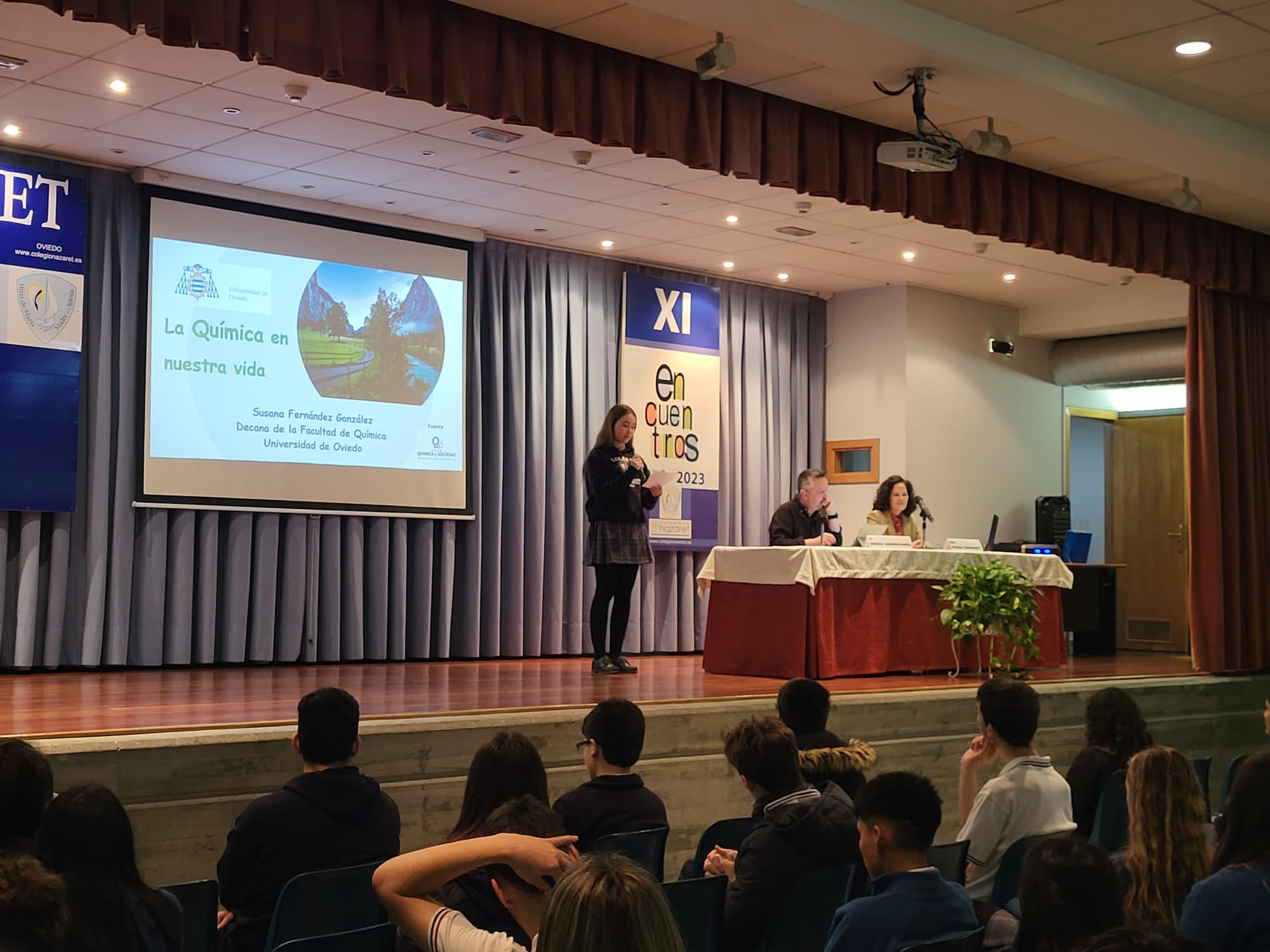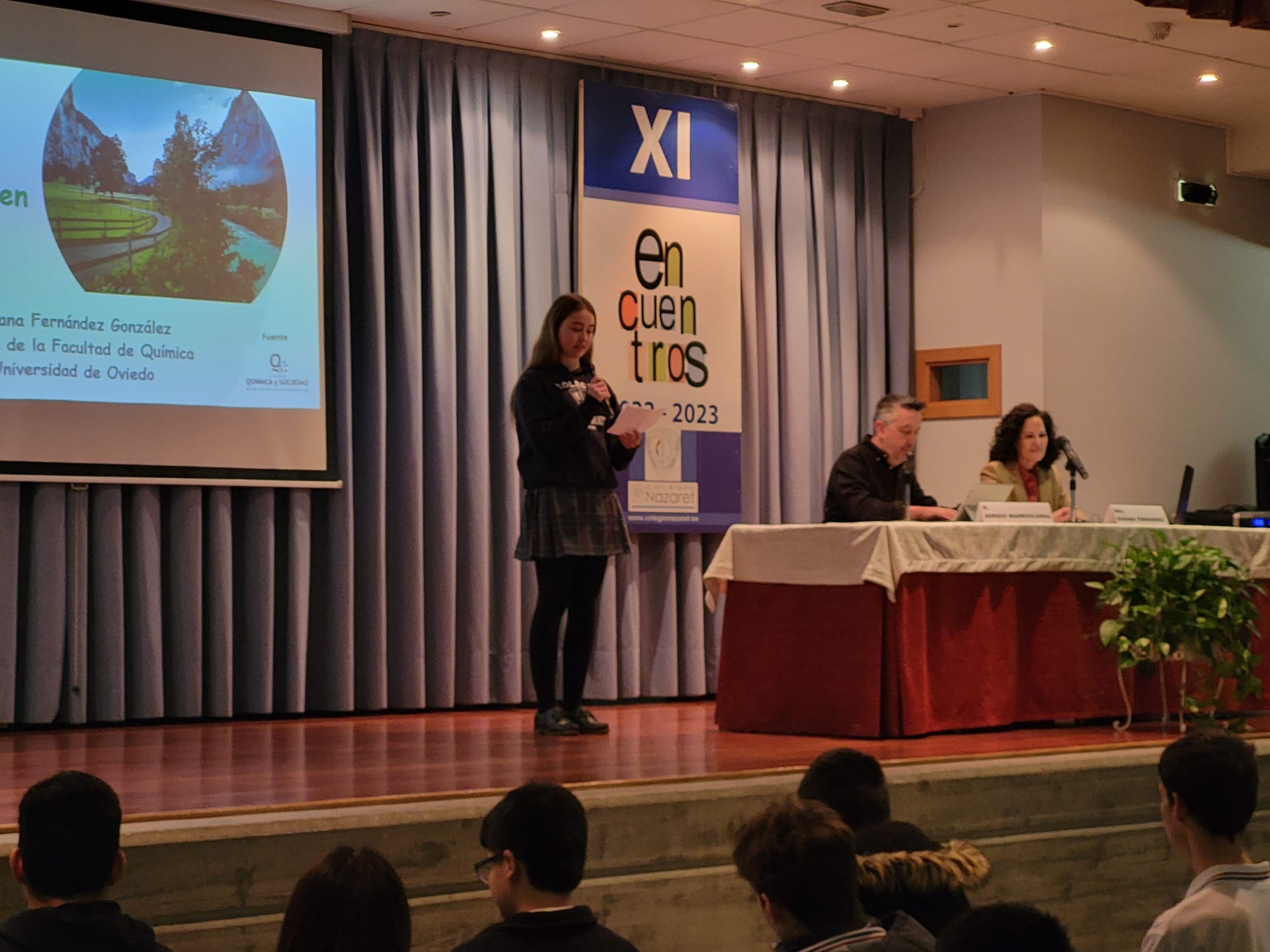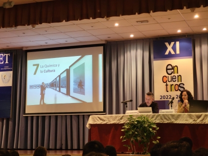 Y, el último "Encuentro" de este año corrió a cargo de Susana Fernández, decana de la facultad de Química de la Universidad de Oviedo, que ilustró a los alumnos de 2º y 4º de ESO sobre los casi infinitos usos de la Química en la sociedad actual. Empezó su charla hablando de la contribución de la Química al área de la salud: vacunas, antibióticos, alivio del dolor, además de materias quirúrgicos e, incluso, la ingeniería molecular o los órganos artificiales. Más adelante prosiguió enumerando los aportes de la Química en el terreno de la alimentación, como los fertilizantes o la conservación de alimentos. Durante el resto de la conferencia se detallaron contribuciones esenciales de esta ciencia a múltiples actividades humanas, como el deporte, el vestido, la cultura, el transporte o las nuevas tecnologías. A lo largo de toda su charla, Susana Fernández insistió en la importancia del concepto de la “Química verde” y el desarrollo sostenible, en contraposición al concepto desfasado de la química contaminante y antiecológica. Esperemos que este encuentro con la decana haya servido para despertar alguna vocación científica o, al menos, para avivar las llamas de la curiosidad por la ciencia en general y la química en particular.