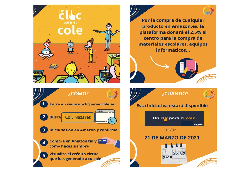Visitando WWW.UNCLICPARAELCOLE.ES y seleccionando nuestro centro educativo, Amazon nos donará un porcentaje de las compras que se realicen a nuestro colegio en forma de crédito virtual.