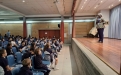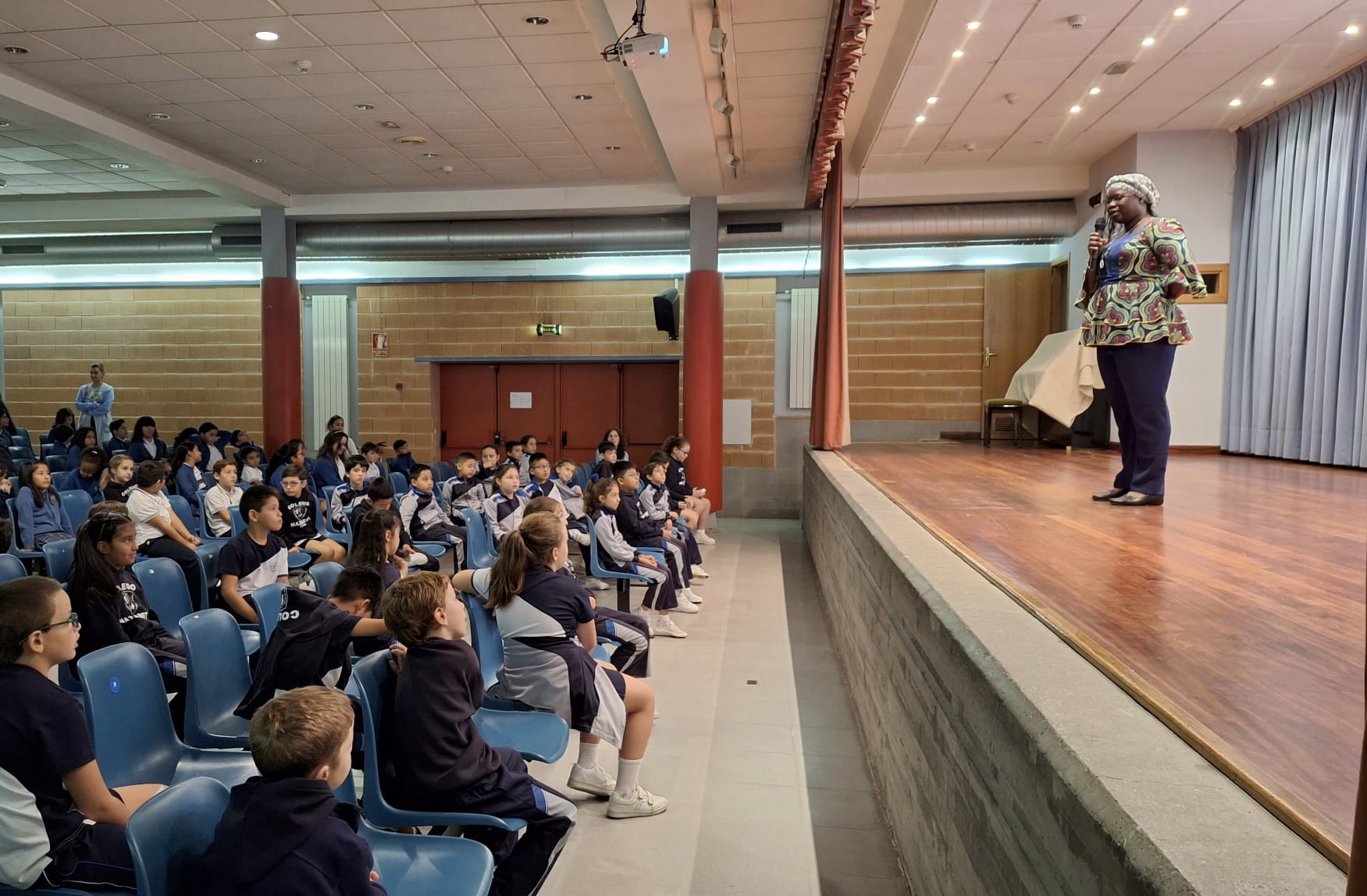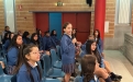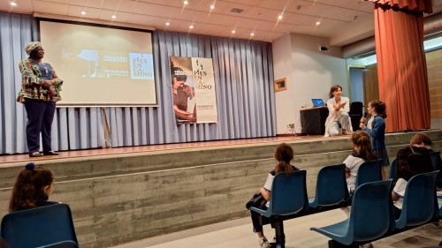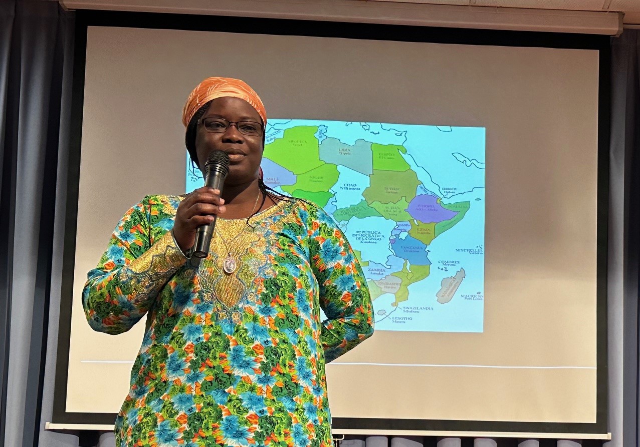 Dentro de nuestra particular campaña de sensibilización en el Colegio, hoy, alumnos y profesores disfrutamos de la presencia de Sabine Avlessi, una novicia de las HMMI, natural de Benín, que nos contó como es la vida en su país. Comenzó con unos breves datos de su biografía ("cómo es Sabine"): estuvo hasta los siete años con sus padres y hermanos y después fue a vivir a un internado, donde permaneció hasta obtener la licenciatura en Geografía. Sin perder la sonrisa en ningún momento, nos transmitió su agradecida alegría de vivir y su sólida fe, explicando lo diferentes que resultan nuestros dos mundos.
