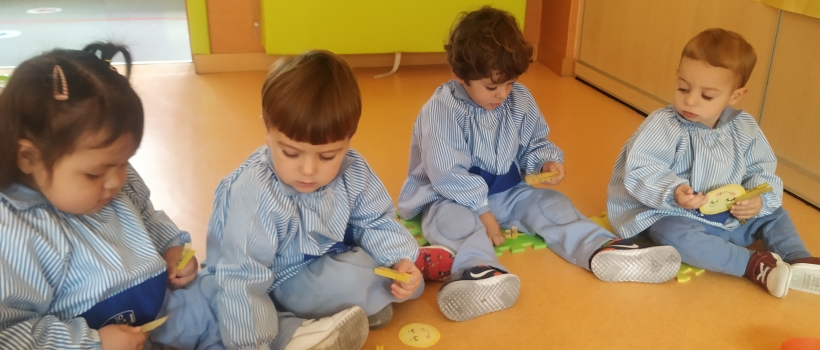 En la guardería Nazaret están trabajando los conceptos temporales básicos, día-noche, y en estos días han centrado la atención en el Sol, haciendo un mural practicando la expresión en inglés "Good morning", y lo que vemos cuando miramos durante la mañana al cielo, básicamente sol y nubes. También aprovechan el concepto Sol para trabajar la motricidad fina, pegando y quitando pequeños pompones en los soles de las ventanas y colocando los rayos en los soles de cartulina.
