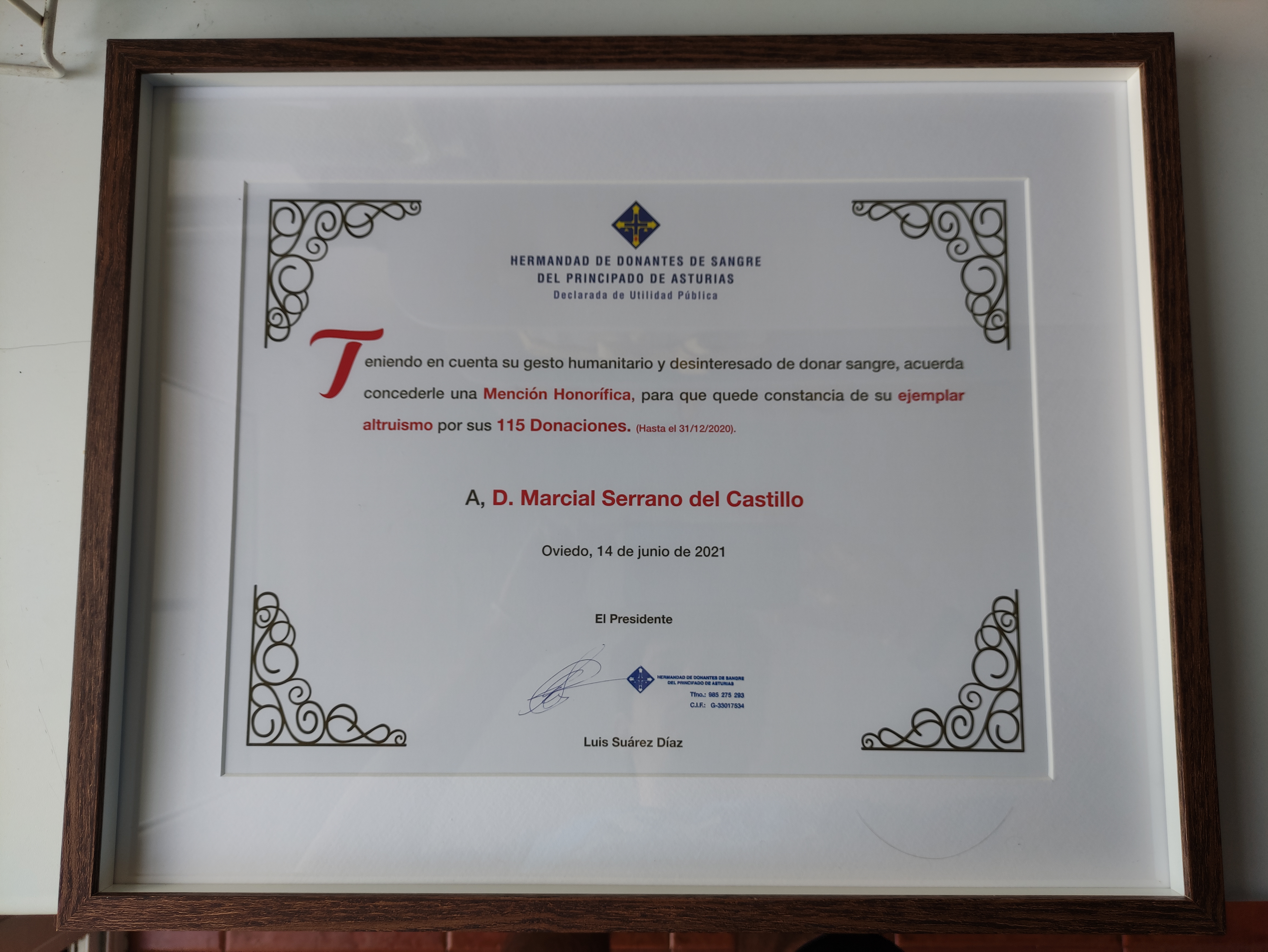 Marcial Serrano del Castillo, nuestro profesor de Biología, fue reconocido ayer lunes, en el DÍA MUNDIAL DEL DONANTE DE SANGRE, con un diploma que le acredita como uno de los cinco grandes donantes de Oviedo. El acto de entrega tuvo lugar en el salón de plenos del Ayuntamiento y fue presidido por el propio alcalde, el presidente de la Hermandad de Donantes de Sangre y la directora del Centro Comunitario de Sangre y Tejidos. Todos reconocieron, en las personas de estos cinco grandes donantes, el ejemplo más puro de altruismo que supone la donación de sangre. El acto forma parte de una campaña para promover las donaciones, pues estas se han visto muy disminuidas debido a la crisis de la COVID.