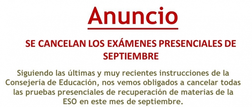 Con motivo de las medidas adoptadas por la Consejería de Educación en relación a la cancelación de los exámenes extraordinarios de septiembre (ESO) de forma presencial, os informamos de las FECHAS Y HORARIOS DEBIDAMENTE ACTUALIZADOS. Dadas las circunstancias es indispensable respetar rigurosamente el tramo horario establecido para cada prueba, pasado el cual, el alumno se considerará como no presentado.