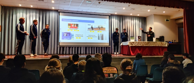Nuestros amigos del Real Oviedo Genuine nos visitaron de nuevo este curso para compartir con los alumnos y alumnas de 2º y 3º de ESO su experiencia deportiva y vital como personas con discapacidad. En primer lugar, describieron las condiciones de la competición de la Liga Genuine, pionera en todo el mundo como competición deportiva para personas con discapacidad: abierta a hombres y mujeres, totalmente inclusiva y con un sistema de puntuación que premia la solidaridad y el fair play. Para terminar, los futbolistas jugaron unos cuantos partidos en la cancha del colegio con los alumnos y alumnas que se atrevieron a enfrentarse a ellos.