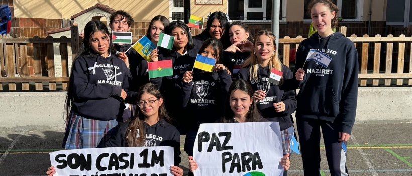 Un año más, la Comunidad Educativa del Colegio Nazaret ha conmemorado hoy, 30 de enero de 2024, el DÍA ESOLAR DE LA NO VIOLENCIA Y LA PAZ. Los alumnos de 3º de Diversificación elaboraron un mural con las manos dibujadas por todos los alumnos, desde E. Infantil hasta E. Secundaria, para recordar que, “mano con mano”, podemos conseguir la paz en el mundo que todos ansiamos. Por su parte, también las manos chiquitinas de los niños de la Guardería crearon un mural alrededor de la paloma de la paz.