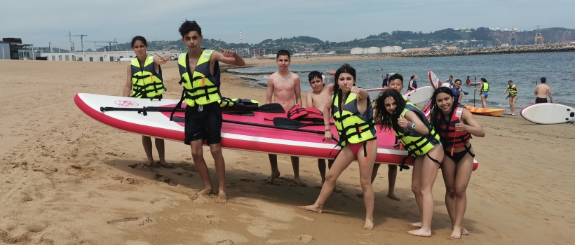 Los alumnos de 1º ESO realizaron una actividad de paddle-surf en la playa de Poniente, en Gijón, como deporte de aventura para despedir el curso. Estuvieron acompañados por sus tutores (Aroa Méndez y Marcial Serrano) y su profesor de Educación Física (Diego Gullón).