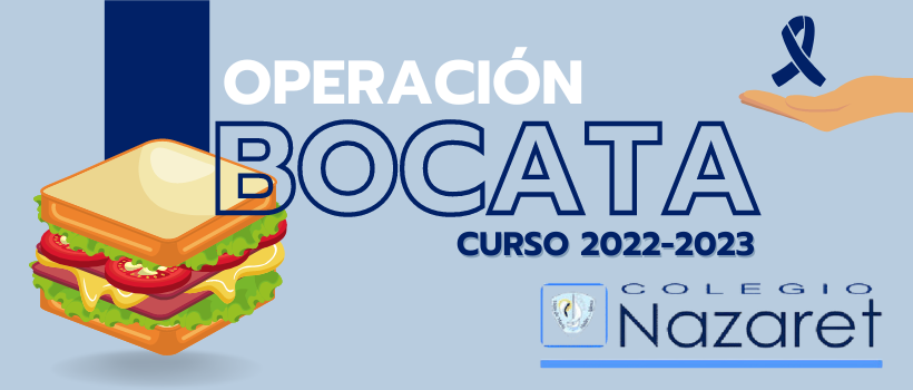 El próximo lunes, 29 de mayo, celebraremos la Operación Bocata (para los alumnos desde 3º de E. Primaria a 4º de ESO) a partir de las 13:00 horas. Por supuesto, están invitados familiares, antiguos alumnos y toda la comunidad educativa del Colegio Nazaret. Cada bocata y bebida tiene un precio solidario de 5€. Ese importe se puede entregar al tutor hasta el día 18 de mayo, jueves. Este año no se entregará tique a los alumnos, cada tutor anotará en su lista a los participantes y, ese día, les entregará el bocadillo personalmente. La Operación Bollín (para los niños de E. Infantil y de 1º y 2º de E. Primaria) se realizará ese mismo día por la tarde.