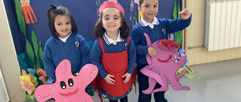 Los niños de 3 años han comenzado el proyecto: "En el fondo del mar". Han recibido un mensaje del Puchi, el caballito de mar que les invita a ayudar a Violeta, la sirena y a todos los animales marinos a cuidar el mar y conseguir colores para dejarlo más bonito y que el pirata Juanito esté muy contento.
