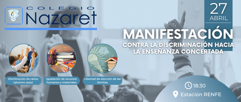 Desde el COLEGIO NAZARET os convocamos a la MANIFESTACIÓN del próximo jueves, 27 de abril, contra la DISCRIMINACIÓN DE LA ENSEÑANZA CONCERTADA. A las 18:30h., saldremos de la estación de RENFE de Oviedo para defender la LIBERTAD DE ELECCIÓN DE LAS FAMILIAS, LA DISMINUCIÓN DE RATIOS (alumnos/aula) y la EQUIPARACIÓN DE RECURSOS HUMANOS Y MATERIALES.