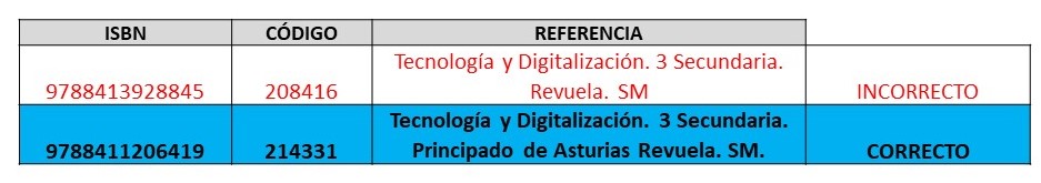 El libro de TECNOLOGÍA de 3º de ESO ha sufrido un cambio para adaptarse al currículo del Principado de Asturias. Por lo tanto, el ISBN 9788413928845, correspondiente al libro nacional, no sería correcto, pasando a ser el ISBN 9788411206419. En cuanto a los pedidos que hemos tramitado en el colegio, ya lo hemos modificado para que llegue con la referencia correcta.